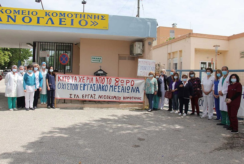 Στις 05/05 μπροστά από την κεντρική πύλη του Γενικού Νοσοκομείου Κομοτηνής «Σισμανόγλειο» πραγματοποιήθηκε παράσταση διαμαρτυρίας εργαζομένων ενάντια στο νέο εργασιακό νομοσχέδιο. Οι εργαζόμενοι κρατούσαν πανό που ανέγραφε «Κάτω τα χέρια από το 8ώρο. Όχι στον εργασιακό Μεσαίωνα». Παράλληλα κρατούσαν και άλλο πανό που εξέφραζε την αντίθεσή τους ενάντια στην «ιδιωτικοποίηση» του Νοσοκομείου Κομοτηνής.