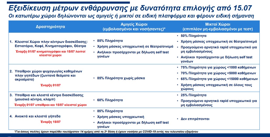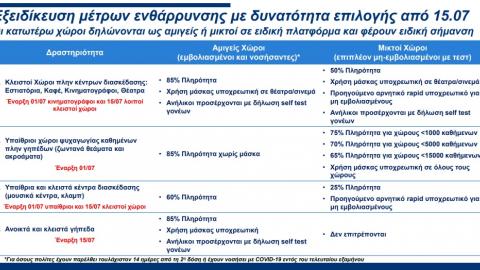 Αναλυτικά τα μέτρα για εστίαση και χώρους ψυχαγωγίας αναφέρονται στον σχετικό πίνακα ενώ διευκρινίζεται πως από 15 Ιουλίου θα είναι ανοικτή και σε λειτουργία η πλατφόρμα του αρμόδιου Υπουργείου με την οποίαν θα γίνεται ο σχετικός έλεγχος των επιχειρήσεων και των εμβολιασμένων ή μη, πολιτών.