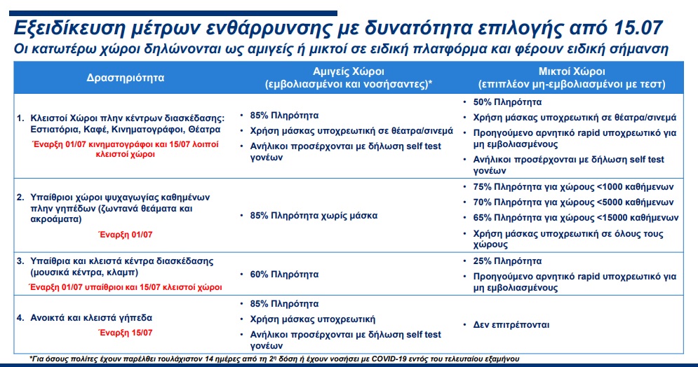 3. Υπαίθρια και κλειστά κέντρα διασκέδασης (μουσικά κέντρα, κλαμπ). Έναρξη 01/07 για τους υπαίθριους και 15/07 για τους κλειστούς. Στους ανωτέρω χώρους που θα είναι αμιγείς θα ισχύει πληρότητα στο 60% ενώ σε όσους θα είναι μικτοί εφαρμόζονται τα ακόλουθα: 25% πληρότητα και προηγούμενο αρνητικό rapid υποχρεωτικό για μη εμβολιασμένους.