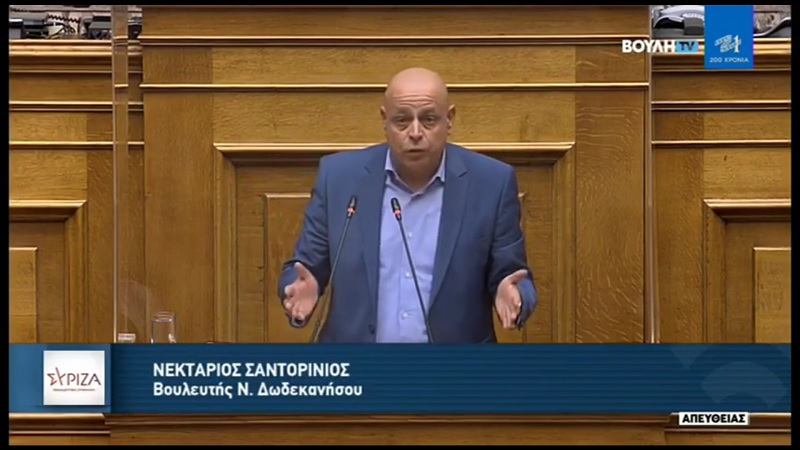 Ο Βουλευτής Δωδεκανήσου και Τομεάρχης Ναυτιλίας και Νησιωτικής Πολιτικής του ΣΥΡΙΖΑ-ΠΣ, άσκησε δριμεία κριτική στην Κυβέρνηση μιλώντας για έναν Προϋπολογισμό «εκτός τόπου και χρόνου» και με μηδενικές ενισχύσεις σε έργα νησιωτικής πολιτικής ενώ αναφέρθηκε διεξοδικά στα προγράμματα  που υπόσχεται το Υπουργείο Ναυτιλίας  χωρίς να περιλαμβάνεται ούτε ένα ευρώ στο πετσοκομμένο κατατεθέν σχέδιο.