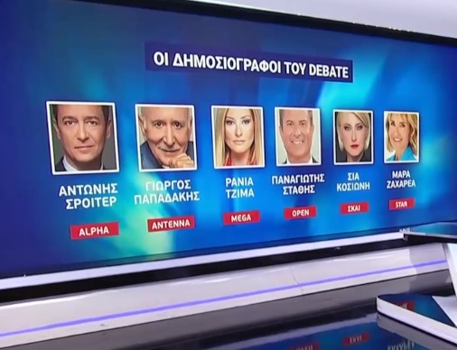 Απέναντί τους θα καθίσουν, με αλφαβητική σειρά, οι δημοσιογράφοι των έξι τηλεοπτικών καναλιών πανελλαδικής εμβέλειας. Η Μάρα Ζαχαρέα (STAR), η Σία Κοσιώνη (ΣΚΑΪ), ο Γιώργος Παπαδάκης (ΑΝΤ1), ο Αντώνης Σρόιτερ (ALPHA), ο Παναγιώτης Στάθης (OPEN) και η Ράνια Τζίμα (MEGA).