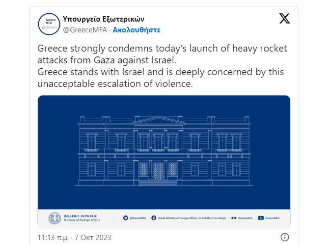 «Η Ελλάδα καταδικάζει απερίφραστα τη σημερινή εκτόξευση ομορβροντίας ρουκετών από τη Γάζα κατά του Ισραήλ. Η Ελλάδα στέκεται στο πλευρό του Ισραήλ και ανησυχεί βαθύτατα από αυτή την απαράδεκτη κλιμάκωση της βίας» τονίζεται σε ανάρτηση του υπουργείου Εξωτερικών στην πλατφόρμα Χ (πρώην Twitter).
