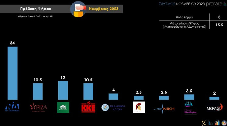 Πιο συγκεκριμένα, στην πρόθεση ψήφου (χωρίς άκυρο, λευκό και αποχή) η εκλογική επιρροή της ΝΔ φτάνει στο 34%, του ΠαΣοΚ στο 12%, του ΣΥΡΙΖΑ-ΠΣ και του ΚΚΕ στο 10,5%, της Ελληνικής Λύσης στο 4%, της Πλεύσης Ελευθερίας στο 3,5%, της Νίκης και των Σπαρτιατών στο 2,5%, του ΜεΡΑ25 στο 2%.