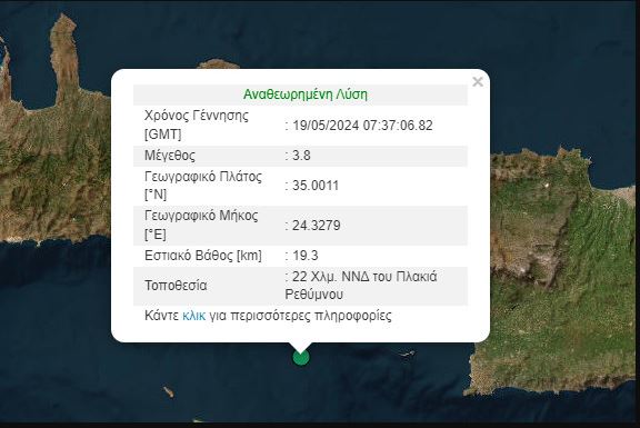 Σεισμική δόνηση σημειώθηκε το πρωί της Κυριακής στην Κρήτη. Σύμφωνα με το Γεωδυναμικό Ινστιτούτο, το μέγεθος η ένταση του σεισμού ανέρχεται στα 3,8 Ρίχτερ ενώ το επίκεντρο εντοπίζεται 22 χιλιόμετρα ΝΝΔ του Πλακιά Ρεθύμνου.