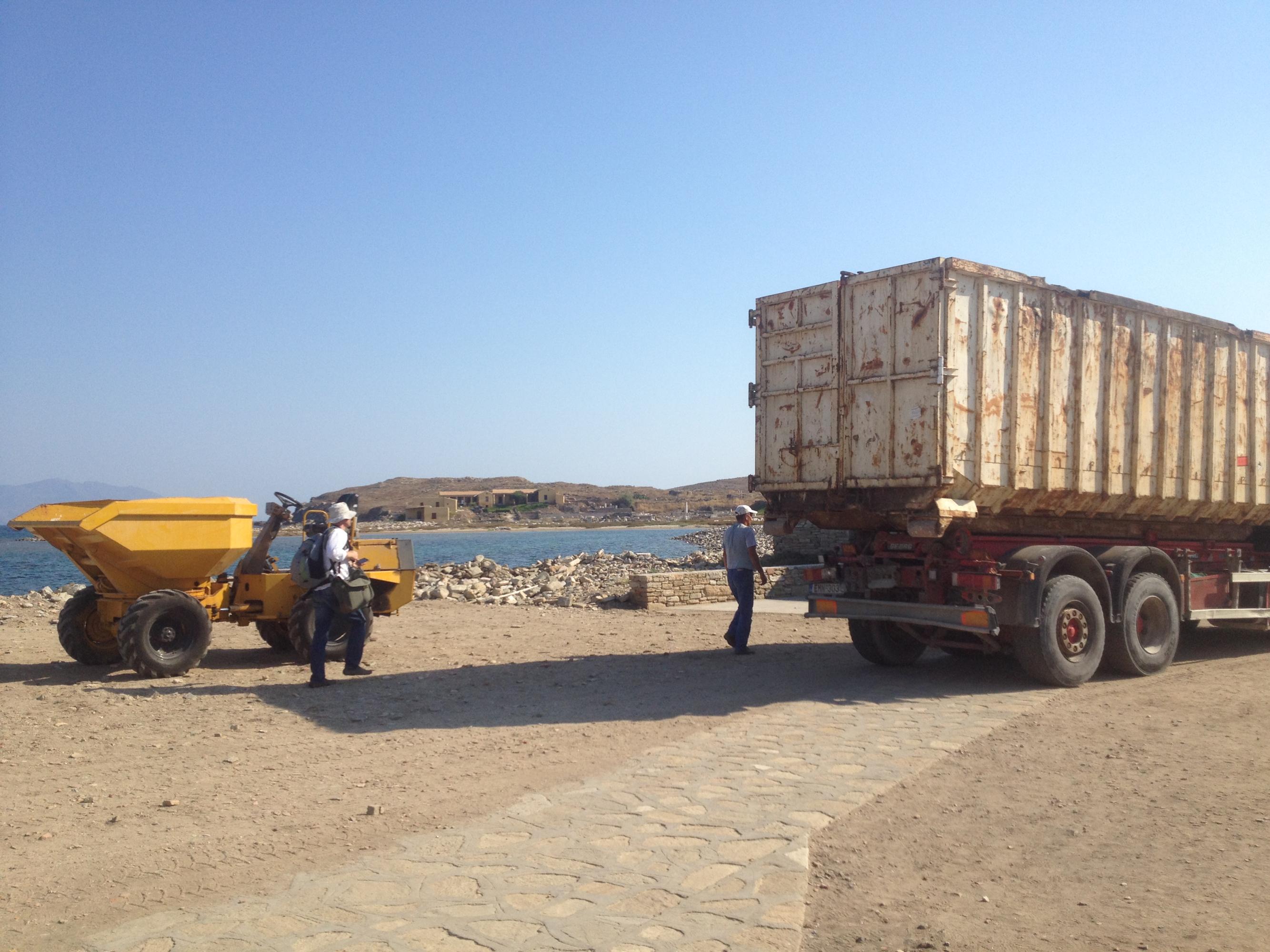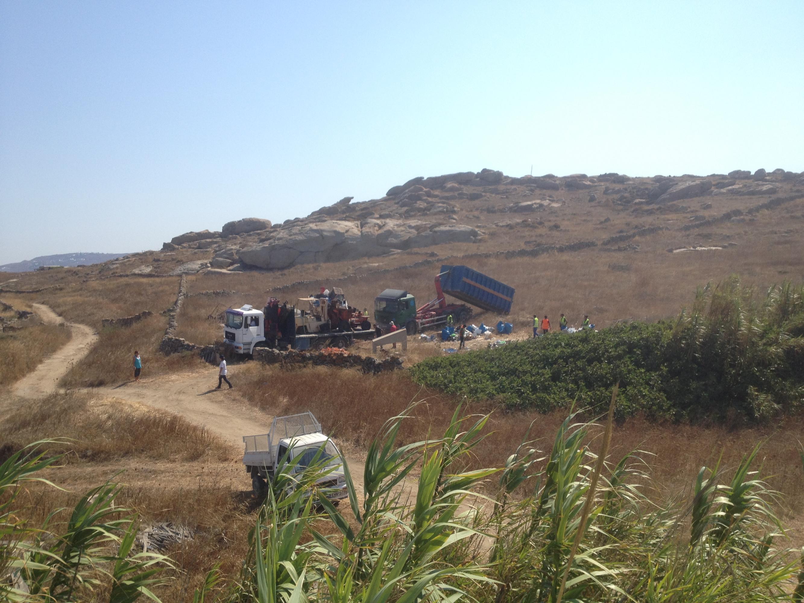 Απομακρύνθηκαν τρία κοντέινερ ανακυκλώσιμου υλικού με νόμιμα παραστατικά, και μεταφέρθηκαν για ανακύκλωση, με ειδικό καράβι/παντόφλα στο νέο λιμάνι της Μυκόνου και από εκεί στο ιδιωτικό ΚΔΑΥ, το οποίο ανέλαβε και όλα τα έξοδα καθώς και το κόστος μεταφοράς. Το εγχείρημα ήταν ιδιαίτερα δύσκολο, γιατί τα σημεία απόθεσης των απορριμμάτων ήταν δυσπρόσιτα και η διέλευση έπρεπε να γίνει με ιδιαίτερη προσοχή. Η όλη προσπάθεια έγινε με επιτυχία και με την συνδρομή και συνεχή παρουσία της διοίκησης της ΚΔΕΠΠΑΜ και της Εφορίας Αρχαιοτήτων την οποία και ευχαριστούμε.