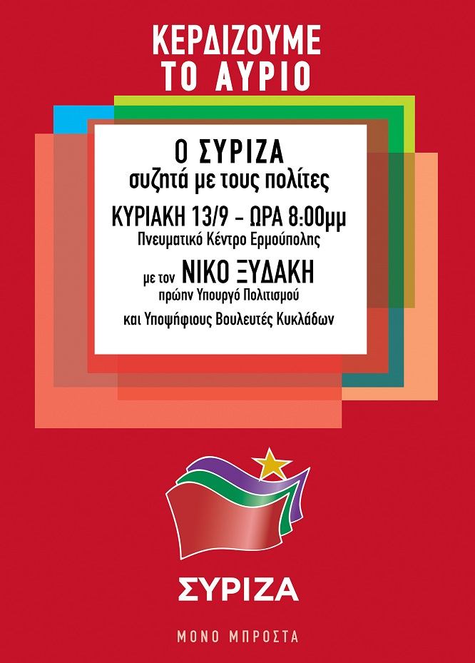 Ο ΣΥΡΙΖΑ συζητά με τους πολίτες και τους προσκαλεί στην κεντρική προεκλογική εκδήλωση στη Σύρο, την Κυριακή 13 Σεπτεμβρίου και ώρα 8:00μμ στο Πνευματικό Κέντρο Ερμούπολης.