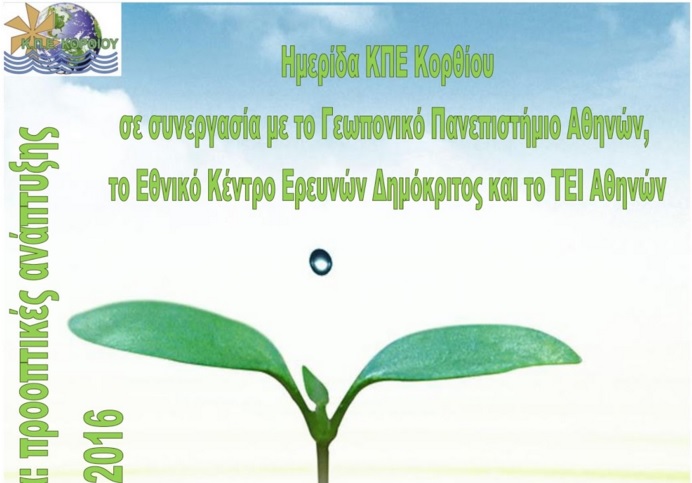 Το ΚΠΕ Κορθίου διοργανώnει ημερίδα με θέμα "Νερό-Ενέργεια & Γεωργία: προοπτικές ανάπτυξης" την Παρασκευή 15 Ιανουαρίου 2016, στην κεντρική αίθουσα παρουσιάσεών του, με την ώρα έναρξης να έχει οριστεί στις 17.00 το απόγευμα.