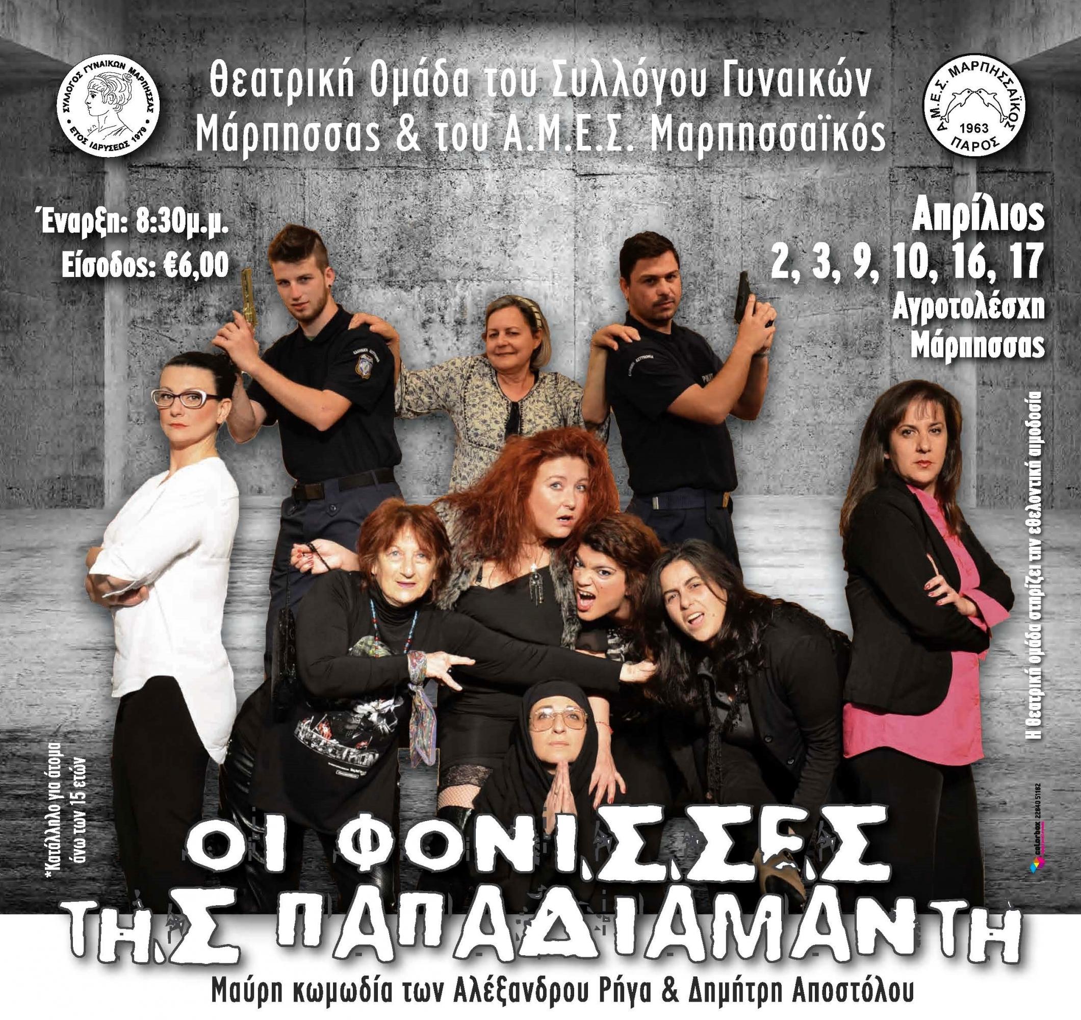Η Θεατρική Ομάδα του Συλλόγου Γυναικών Μάρπησσας και του ΑΜΕΣ Μαρπησσαϊκού παρουσιάζει στις 2,3,9,10,16 & 17 Απριλίου 2016 τη μαύρη κωμωδία των Αλεξ. Ρήγα & Δημ. Αποστόλου "ΟΙ ΦΟΝΙΣΣΕΣ ΤΗΣ ΠΑΠΑΔΙΑΜΑΝΤΗ" στην Αγροτολέσχη της Μάρπησσας και ώρα έναρξης 20:30.
