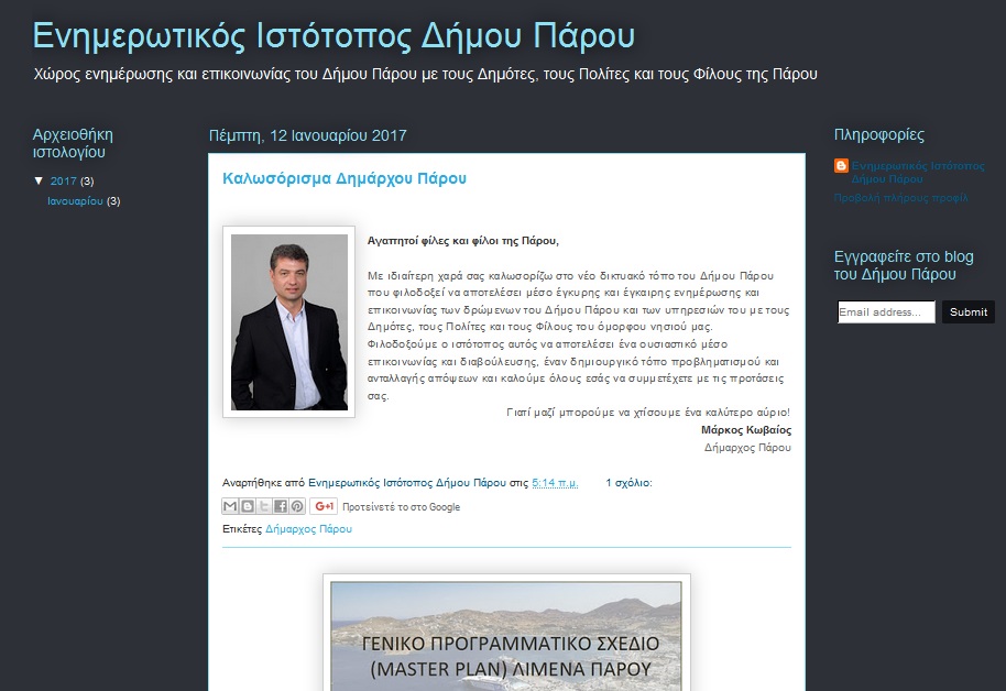 Στο μήνυμα καλωσορίσματος, που έχει αναρτηθεί στο Blog του Δήμου, με την υπογραφή του Δημάρχου Πάρου, κ. Μάρκου Κωβαίου, ο ίδιος σημειώνει, ότι “φιλοδοξούμε ο ιστότοπος αυτός να αποτελέσει ένα ουσιαστικό μέσο επικοινωνίας και διαβούλευσης, έναν δημιουργικό τόπο προβληματισμού και ανταλλαγής απόψεων και καλούμε όλους εσάς να συμμετέχετε με τις προτάσεις σας. Γιατί μαζί μπορούμε να χτίσουμε ένα καλύτερο αύριο!”.