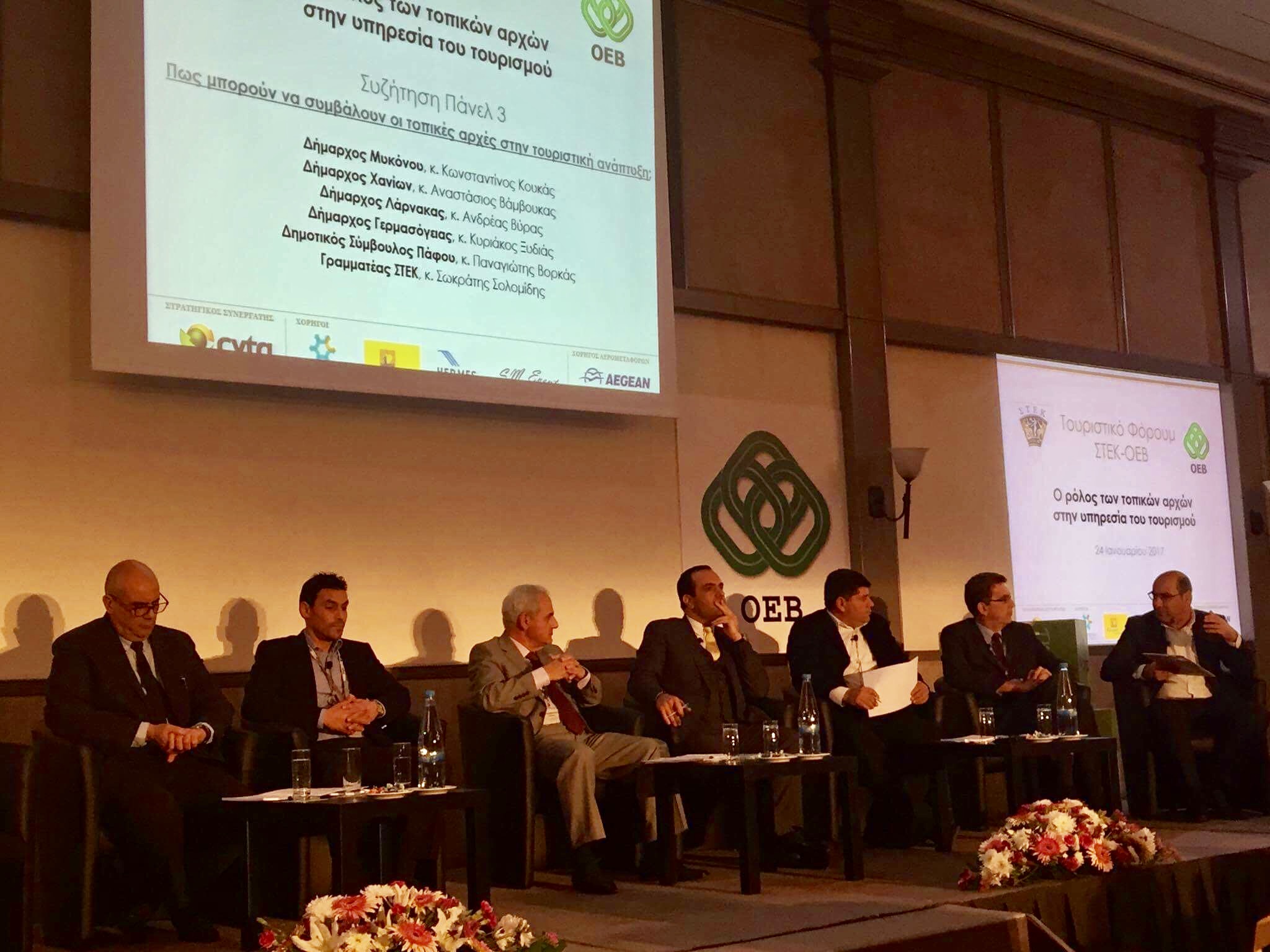 Στο Τουριστικό Φόρουμ ΣΤΕΚ-ΟΕΒ, πραγματοποιήθηκαν τρεις συζητήσεις πάνελ, οι οποίες κατέδειξαν τις προσκλήσεις και τα προβλήματα που αντιμετωπίζουν οι τουριστικές περιοχές της Κύπρου, πρότειναν ενδεχόμενες λύσεις και στη βάση καλών πρακτικών ανέδειξαν τρόπους με τους οποίους οι τοπικές αρχές μαζί με τους κοινωνικούς εταίρους και το κράτος μπορούν να συμβάλουν στην τουριστική ανάπτυξη της περιοχής τους.