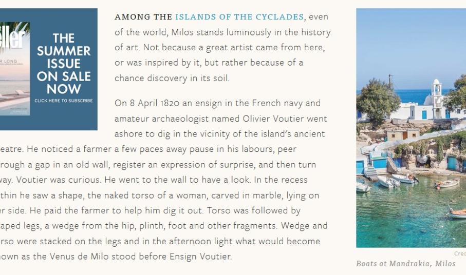Η αρχαία ιστορία της Μήλου, οι απαράμιλλης γοητείας παραλίες, οι τοπικές παραδοσιακές γεύσεις και τα γραφικά χωριά του νησιού πρωταγωνιστούν στο 10σέλιδο αφιέρωμα, το οποίο έχει τίτλο «Μήλος: το μυστικό ελληνικό νησί του καλοκαιριού» και δημοσιεύθηκε στο τεύχος Ιουνίου του περιοδικού και στην ηλεκτρονική έκδοση που υπογράφει ο δημοσιογράφος Timothy O’Grady που είχε επισκεφθεί ξανά προ δεκαετίας το νησί. Σύμφωνα με την επίσημη ενημέρωση της Marketing Greece, σκοπός του ταξιδιού του, το οποίο η ίδια διοργάνωσε σε στρατηγική συνεργασία με την Aegean ήταν “να ανασύρει μνήμες της προηγούμενης επίσκεψής του και να καταγράψει όσα έχουν αλλάξει στο νησί από τότε”. Κατά τη διάρκεια της παραμονής του στο νησί είχε την ευκαιρία να περιηγηθεί στα χωριά του νησιού, όπου εντυπωσιάστηκε από την απλότητα της καθημερινής ζωής, καθώς και να επισκεφθεί τις μαγευτικές παραλίες της Μήλου για τις οποίες σημειώνει:«Υπάρχουν άνθρωποι που θα διέσχιζαν ηπείρους μόνο για να βρεθούν σε μία συγκεκριμένη παραλία. Εγώ δεν είμαι ένας από αυτούς. Όμως οι παραλίες της Μήλου έχουν, για εμένα, μια μοναδική γοητεία. Ξυπνάς και αναρωτιέσαι τι μπορούν να προσφέρουν. Υπάρχει μία, ή μάλλον περισσότερες, για κάθε γούστο». Επιπλέον, ο δημοσιογράφος περιγράφει με γλαφυρότητα τα χρώματα του βραχώδους νησιού και το πλούσιο σε ορυκτά τοπίο και τονίζει: «Ύστερα κατευθύνεσαι προς Βάνι, στο βορειοδυτικό άκρο του νησιού και φτάνεις στο λιμάνι το ηλιοβασίλεμα, έχοντας διασχίσει πύργους από μαγγάνιο και άλλα ηφαιστειακά πετρώματα σε χρώματα μαύρο, μπλε και πράσινο και μοτίβο όπως το δέρμα του φιδιού. Το νησί μοιάζει με γκαλερί. Λέγεται ότι ένα τραγουδιστής και γλύπτης, με το όνομα Αλέξανδρος και με καταγωγή από την Αντιόχεια, σκάλισε την Αφροδίτη. Η Μήλος μέσα από το νερό φαίνεται σαν μια μνημειώδης πράξη της φαντασίας, κάτι που ένας καλλιτέχνης θα έκανε αν ήταν θεός».