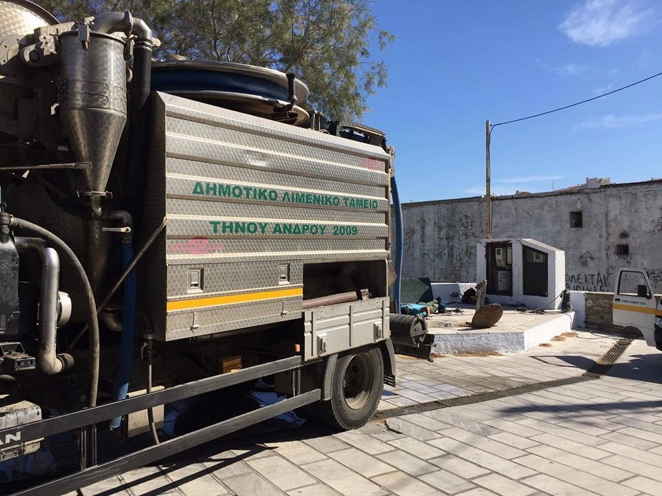 Μετά από επανειλημμένες οχλήσεις του Δήμου Άνδρου, κατέφτασε από την Τήνο το ειδικό όχημα που ανήκει στο Δημοτικό Λιμενικό Ταμείο Τήνου-Άνδρου, προκειμένου να προχωρήσει σε προληπτικούς και αναγκαίους καθαρισμούς και συντηρήσεις στα φρεάτια και γενικότερα στο δίκτυο ομβρίων υδάτων σε Χώρα, Κόρθι, Γαύριο και Μπατσί.