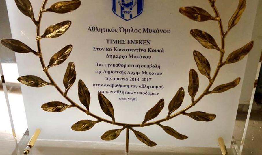 Στο πρόσωπο του Δημάρχου Μυκόνου κ. Κωνσταντίνου Κουκά, ο Αθλητικός Όμιλος Μυκόνου τίμησε τη Δημοτική Αρχή για την καθοριστική συμβολή της στην αναβάθμιση του αθλητισμού και των αθλητικών υποδομών στο νησί, κατά την τριετία 2014 - 2017.