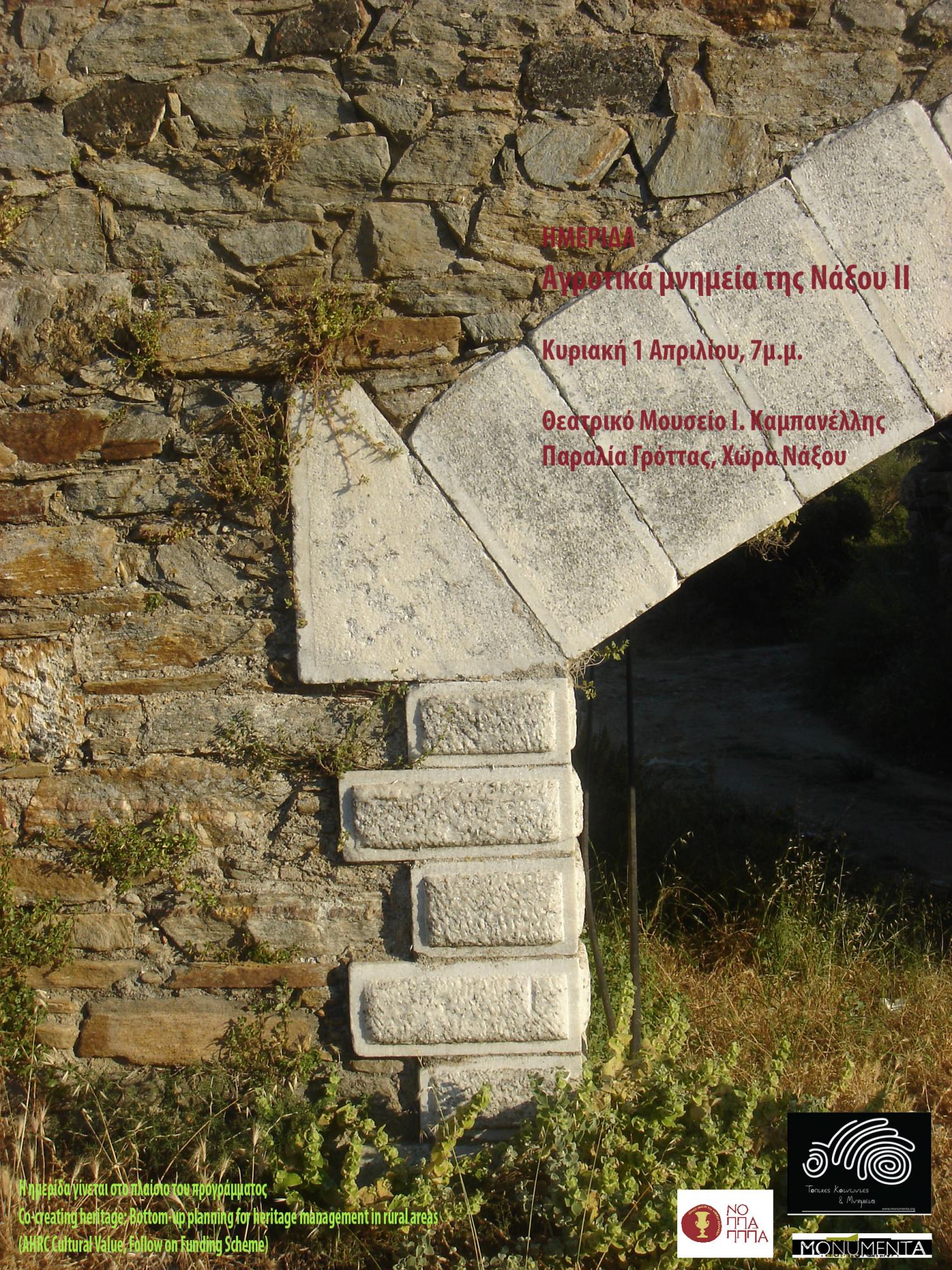 Η ΜΟΝUMENTA και ο ΝΟΠΠΑΠΠΠΑ οργανώνουν ημερίδα με θέμα Αγροτικά μνημεία της Νάξου ΙΙ, την Κυριακή 1 Απριλίου, 7μ.μ., στο Θεατρικό Μουσείο Ι. Καμπανέλλης, Παραλία Γρόττας, Χώρα Νάξου.