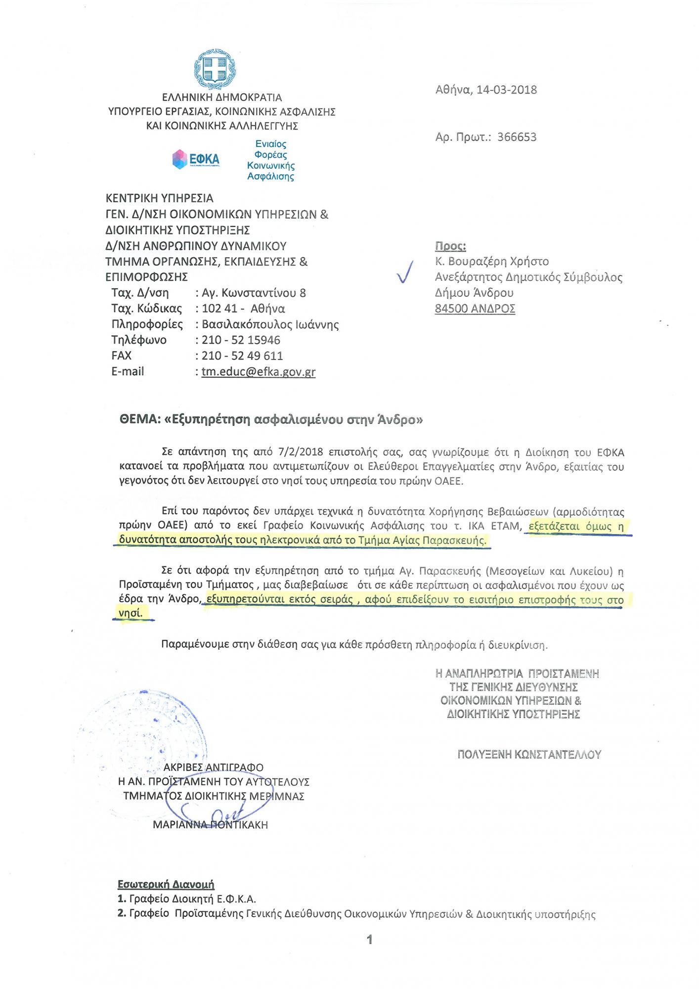 Είμαι στην ευχάριστη θέση να σας ανακοινώσω ότι μετά την αποστολή της από 07/02/2018 επιστολής μου προς τον Πρόεδρο του Ε.Φ.Κ.Α., στην οποία ανέφερα την μεγάλη ταλαιπωρία που υφιστάμεθα όλοι εμείς οι επαγγελματίες της Άνδρου όταν χρειαζόμαστε κάποια βεβαίωση από τον πρώην (Ο.Α.Ε.Ε.), την οποία και είχα αναρτήσει, η απάντηση από την Διοίκηση του φορέα αρχικά μας ικανοποιεί και μας χαροποιεί ιδιαίτερα. Από τις 14/03/2018 λοιπόν, όποιος επαγγελματίας από το Νησί μας επιδεικνύει το εισιτήριο επιστροφής, δεν θα περιμένει σε καμία ουρά και θα εξυπηρετείται κατά προτεραιότητα. Επίσης, εξετάζεται η περίπτωση ηλεκτρονικής αποστολής των βεβαιώσεων χωρίς να χρειάζεται να ταξιδέψουμε στην Αθήνα για αυτό. Ευχαριστούμε για την άμεση ανταπόκριση από πλευράς Διοίκησης Ε.Φ.Κ.Α. και περιμένουμε για την εφαρμογή των ανωτέρω στην πράξη.