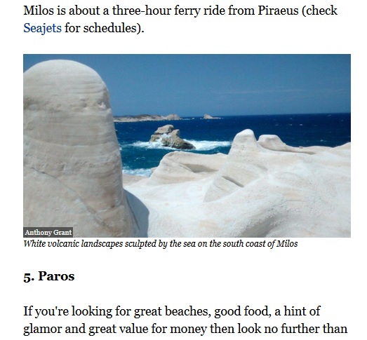 «Εάν ψάχνεις για τέλειες παραλίες, καλό φαγητό, μια νότα γοητείας και καλή σχέση αξίας  με χρήματα, τότε το νησί της Πάρου είναι αυτό που ψάχνεις. Βρίσκεται στα νότια από το διασημότερο (και ακριβότερο) νησί της Μυκόνου. Παρόλα αυτά, είναι το αγαπημένο σημείο διακοπών για τους ιδίους  τους Έλληνες. Η κοσμοπολίτικη πόλη της  Νάουσας διαθέτει πάρα πολλά εστιατόρια και ταβέρνες με θαλασσινά, κοντά σε ωραίες, μη πολυπληθείς παραλίες. Το καραβάκι σε δέκα λεπτά σε πάει βόλτα στο μικρό νησί της Αντίπαρου, το οποίο έχει περισσότερες ωραίες παραλίες (και όπου ο Tom Hanks έχει το σπίτι του)».