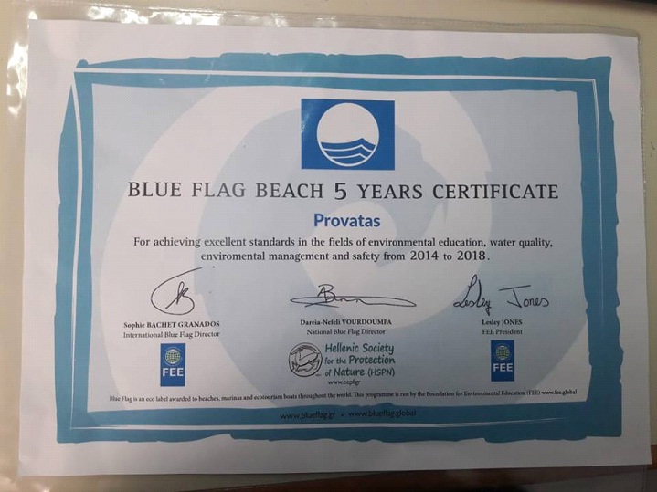 Με το βραβείο «BLUE FLAG BEACH 5 YEARS CERTIFICATE – Provatas» τιμήθηκε η Μήλος για την παραλία του Προβατά, για την επίτευξη εξαιρετικών προτύπων στους τομείς της περιβαλλοντικής εκπαίδευσης, της ποιότητας των υδάτων, της περιβαλλοντικής διαχείρισης και της ασφάλειας από το 2014 έως το 2018.