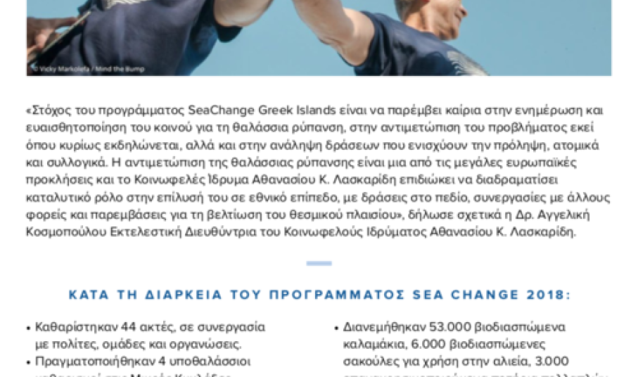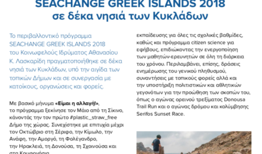 Το περιβαλλοντικό πρόγραμμα SEACHANGE GREEK ISLANDS 2018 του Κοινωφελούς Ιδρύματος Αθανασίου Κ. Λασκαρίδη πραγματοποιήθηκε σε δέκα νησιά των Κυκλάδων, υπό την αιγίδα των τοπικών Δήμων και σε συνεργασία με κατοίκους, οργανώσεις και φορείς. Με βασικό μήνυμα «Είμαι η αλλαγή!», το πρόγραμμα ξεκίνησε τον Μάιο από τη Σίκινο, κάνοντάς την τον πρώτο #plastic_straw_free Δήμο της χώρας. Συνεχίστηκε με επιτυχία μέχρι τον Οκτώβριο στη Σέριφο, την Κίμωλο, την Ανάφη, την Αμοργό, τη Φολέγανδρο, την Ηρακλειά, τη Δονούσα, τη Σχοινούσα και στα Κουφονήσια.