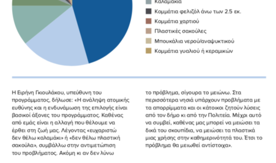 Η Ειρήνη Γκιουλάκου, υπεύθυνη του προγράμματος, δήλωσε: «Η ανάληψη ατομικής ευθύνης και η ενδυνάμωση της επιλογής είναι βασικοί άξονες του προγράμματος. Καθένας από εμάς είναι η αλλαγή που θέλουμε να έρθει στη ζωή μας. Λέγοντας «ευχαριστώ δεν θέλω καλαμάκι» ή «δεν θέλω πλαστική σακούλα», συμβάλλω στην αντιμετώπιση του προβλήματος. Ακόμη κι αν δεν λύνω το πρόβλημα, σίγουρα το μειώνω. Στα περισσότερα νησιά υπάρχουν προβλήματα με τα απορρίμματα και οι κάτοικοι ζητούν λύσεις από τον δήμο κι από την Πολιτεία. Μέχρι αυτό να συμβεί, καθένας μας μπορεί να μειώσει τα δικά του σκουπίδια, να μειώσει τα πλαστικά μιας χρήσης στην καθημερινότητά του. Έτσι το πρόβλημα θα μειωθεί αντίστοιχα».
