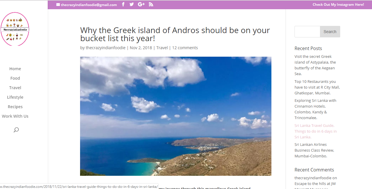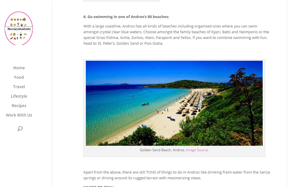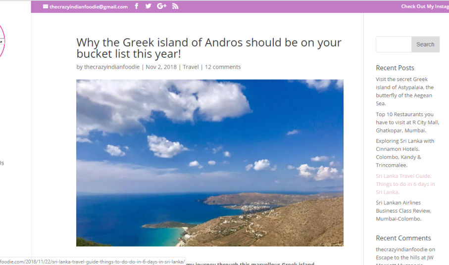 "Έχετε επισκεφθεί ποτέ έναν τόπο τόσο όμορφο, που να σας κόβει την ανάσα και συγχρόνως να σας κάνει να αισθάνεστε ότι ανήκετε εκεί; Το ελληνικό νησί της Άνδρου με έκανε να νιώσω έτσι. Αυτό το συναρπαστικό νησί πρέπει να βρίσκεται στη λίστα τωνπροορισμών σας για φέτος!", αναφέρει στην εισαγωγή του άρθρου της η Ινδή «travel and food blogger».