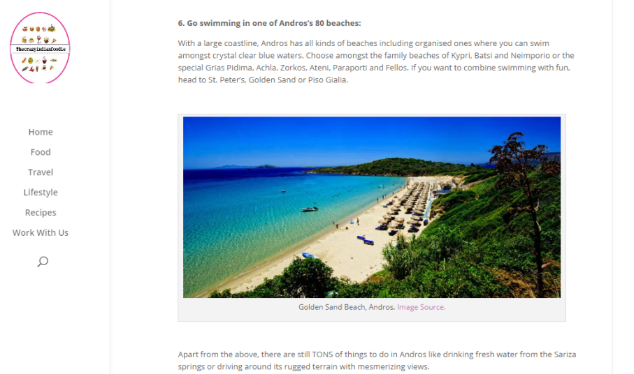 Στη συνέχεια, η Ινδή blogger αναφέρει τις κορυφαίες επιλογές για τον επισκέπτη της Άνδρου, προτείνοντας, μεταξύ άλλων, την επίσκεψη σε μουσεία (Αρχαιολογικό, Μουσείο Μοντέρνας Τέχνης), στο σπήλαιο Αλαδινού, σε μνημεία (Αφανής Ναύτης) και σε μοναστήρια (Ζωοδόχου Πηγής). Επιπλέον, στο άρθρο της, η κα Sanghvi κάνει ιδιαίτερη μνεία στην Κυκλαδίτικη κουζίνα, τα τοπικά προϊόντα και τις μοναδικές γεύσεις της Άνδρου, αλλά και στις υπέροχες αναρίθμητες παραλίες της, που καλύπτουν όλες τις προτιμήσεις.
