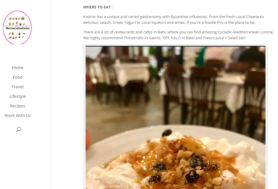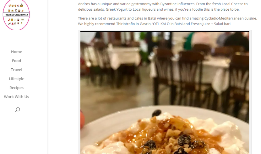 Μπορείτε να διαβάσετε το άρθρο της Devashree Sanghvi από τον παρακάτω σύνδεσμο: https://www.thecrazyindianfoodie.com/2018/11/02/why-the-greek-island-of-andros-should-be-on-your-bucket-list-this-year/?fbclid=IwAR0oQm-hQ_Dw1g2IwgJ1vT2-snubEXMu27T-bktmAXQFVhRm9Uc5FvyIWfA