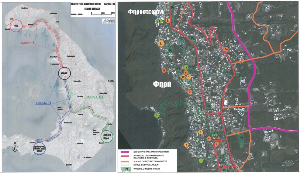 Το αντικείμενο της μελέτης επικεντρώνεται στη βελτίωση των συνθηκών προσβασιμότητας των στοιχείων ενδιαφέροντος κατά μήκος της “Πολιτιστικής Διαδρομής Θήρας” η οποία αρθρώνεται με αφετηρία την πόλη των Φηρών και εκτείνεται προς τρεις κατευθύνσεις, οι οποίες καταλήγουν στην Οία, ως κύριο τουριστικό πόλο του νησιού και στους βασικούς αρχαιολογικούς χώρους του προϊστορικού οικισμού Ακρωτηρίου και της Αρχαίας Θήρας. Με αφετηρία την πόλη των Φηρών, η οποία αποτελεί το κύριο σημείο αναφοράς με την κεντροβαρική της θέση, το πληθυσμιακό της μέγεθος, το ρόλο της ως δεσπόζοντος πόλου συγκέντρωσης των αφικνούμενων επισκεπτών του νησιού και ως διοικητικού του κέντρου, αναπτύσσονται τα τρία διακριτά τμήματα της Πολιτιστικής Διαδρομής της Θήρας.