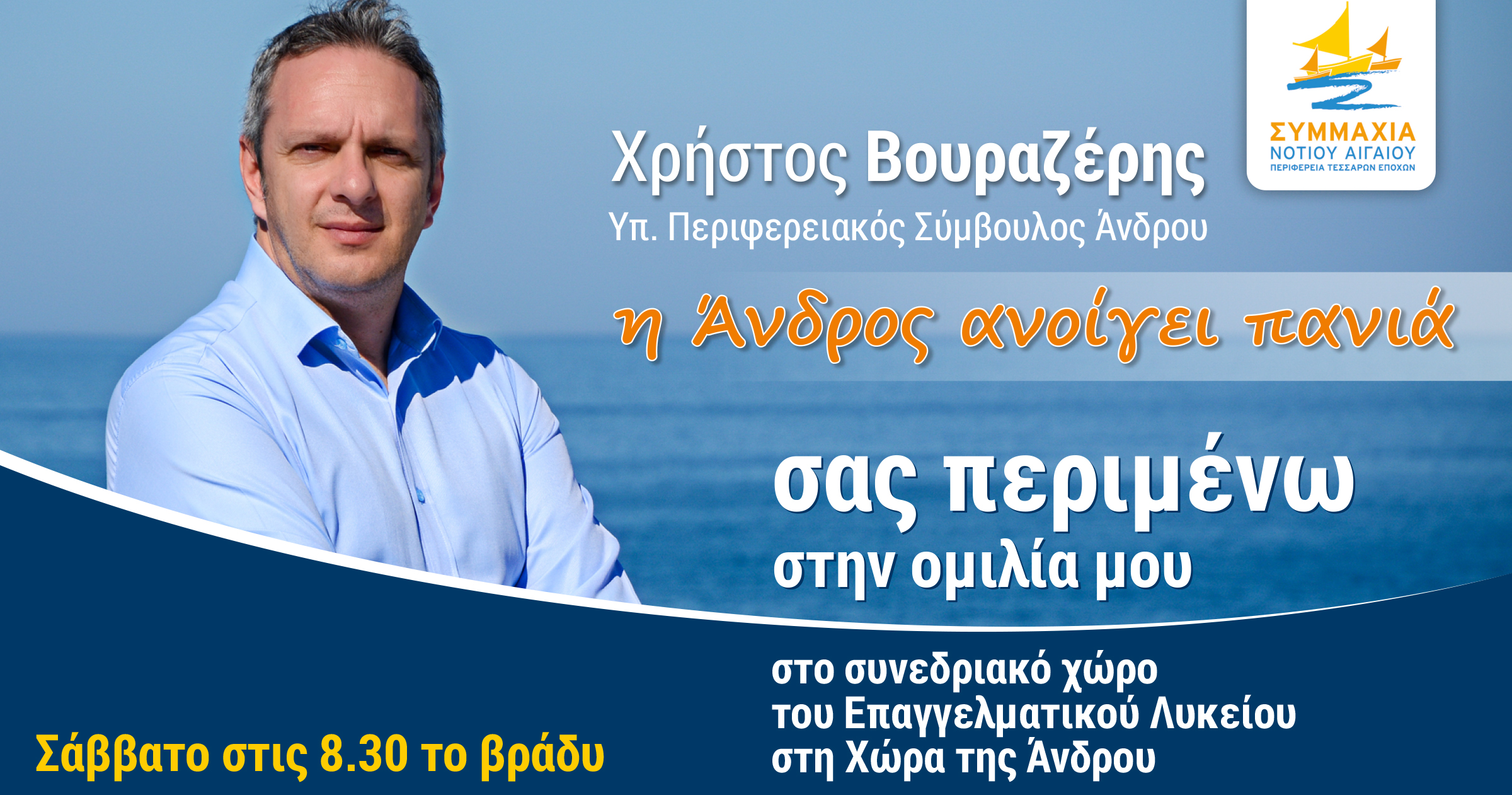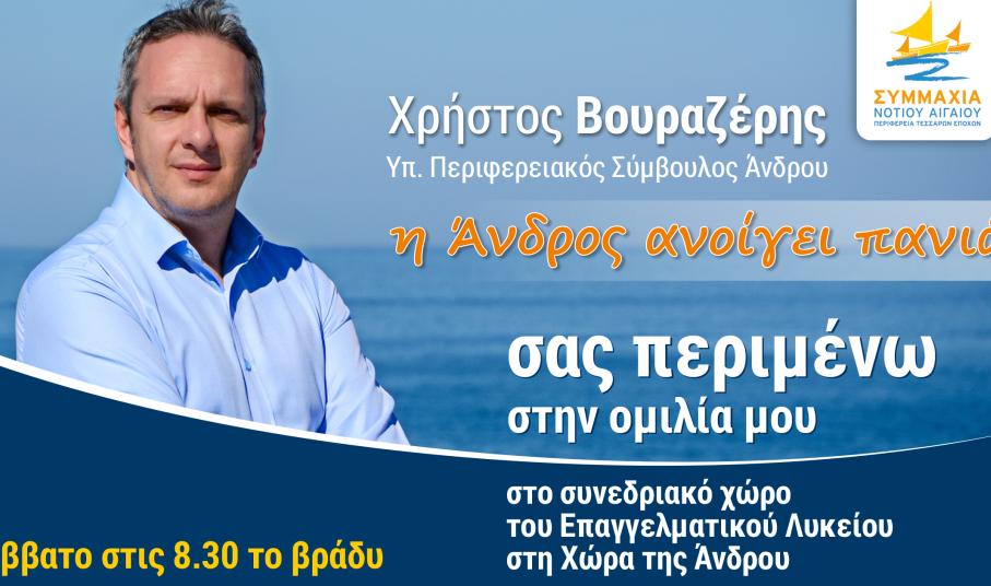 Ο υποψήφιος, με την παράταξη "Συμμαχία Νοτίου Αιγαίου", του Μανώλη Γλυνού, περιφερειακός σύμβουλος Άνδρου, κ. Χρήστος Βουραζέρης, προσκαλεί στην ομιλία, που θα πραγματοποιήσει στη Χώρα της Άνδρου.