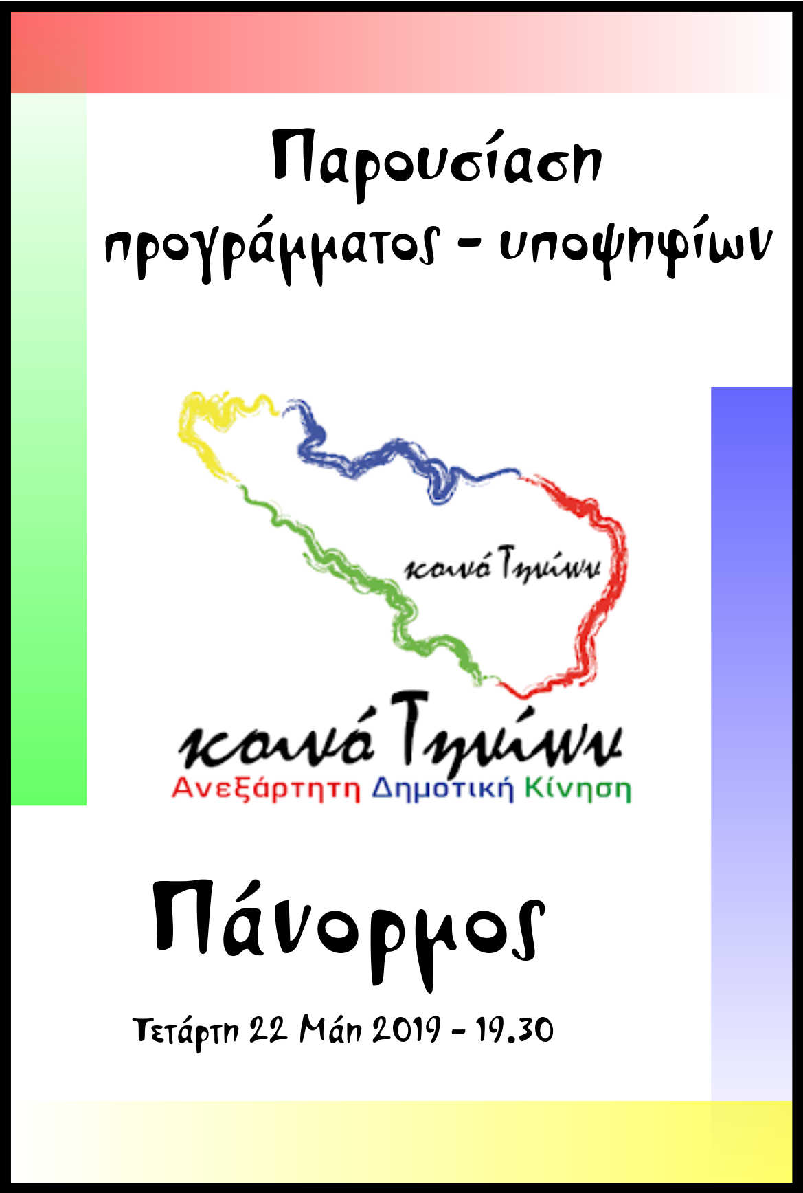 Την Τετάρτη 22 Μάη 2019, το Κοινό Τηνίων θα βρίσκεται στον Πάνορμο στις 19.30 και στον Πύργο, στο Πνευματικό Κέντρο στις 20.30.