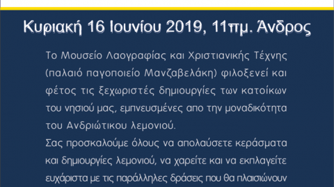 Την Κυριακή, 16 Ιουνίου, στον ανοιχτό χώρο του Παλιού Παγοποιείου Μαντζαβελάκη, θα στηθούν διακοσμημένοι πάγκοι από 28 εκθέτες και οι επισκέπτες θα μπορούν να απολαύσουν γλυκίσματα, λεμονάδες, λικέρ και δημιουργίες όπως χειροτεχνήματα, σαπούνια λεμονιού και κοσμήματα. Μέσα στο μουσείο, θα βρίσκονται τα δημιουργήματα των Ανδριωτών εικαστικών, οι οποίοι έχουν εμπνευστεί από τον ευωδιαστό λεμονοκαρπό.