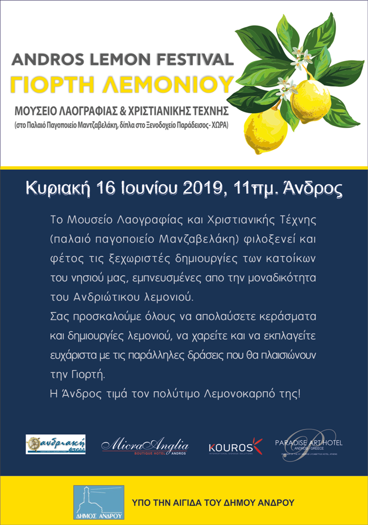 Να σημειωθεί ότι χορηγοί της Γιορτής Λεμονιού είναι η εφημερίδα «Ανδριακή», τα ξενοδοχεία «Micra Anglia» και «Paradise Hotel» και η «Kouros International Signage Solutions».