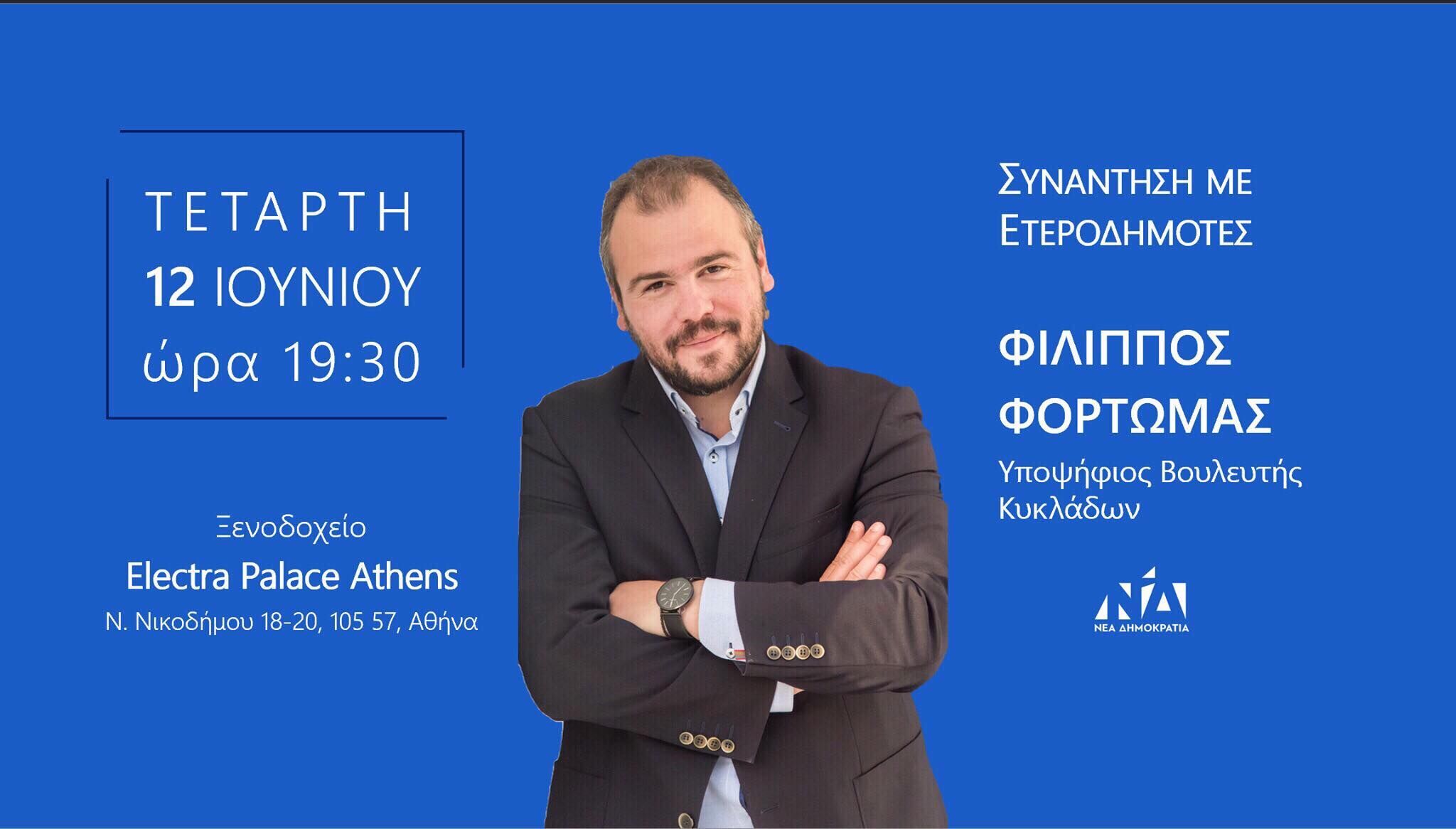 Συνάντηση με τις Κυκλαδίτισσες και τους Κυκλαδίτες ετεροδημότες της Αθήνας πραγματοποιεί την Τετάρτη 12 Ιουνίου στις 19:30, ο υποψήφιος βουλευτής της Νέας Δημοκρατίας του νομού Φίλιππος Φόρτωμας, ενόψει των επερχόμενων εθνικών εκλογών.