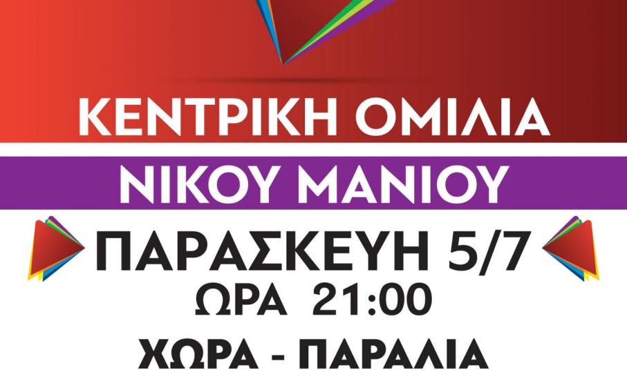 Ο υποψήφιος βουλευτής Κυκλάδων, Νίκος Μανιός θα είναι ο ομιλητής στις πολιτικές εκδηλώσεις του ΣΥΡΙΖΑ - Προοδευτική Συμμαχία, που θα πραγματοποιηθούν σήμερα και αύριο στη Νάξο.