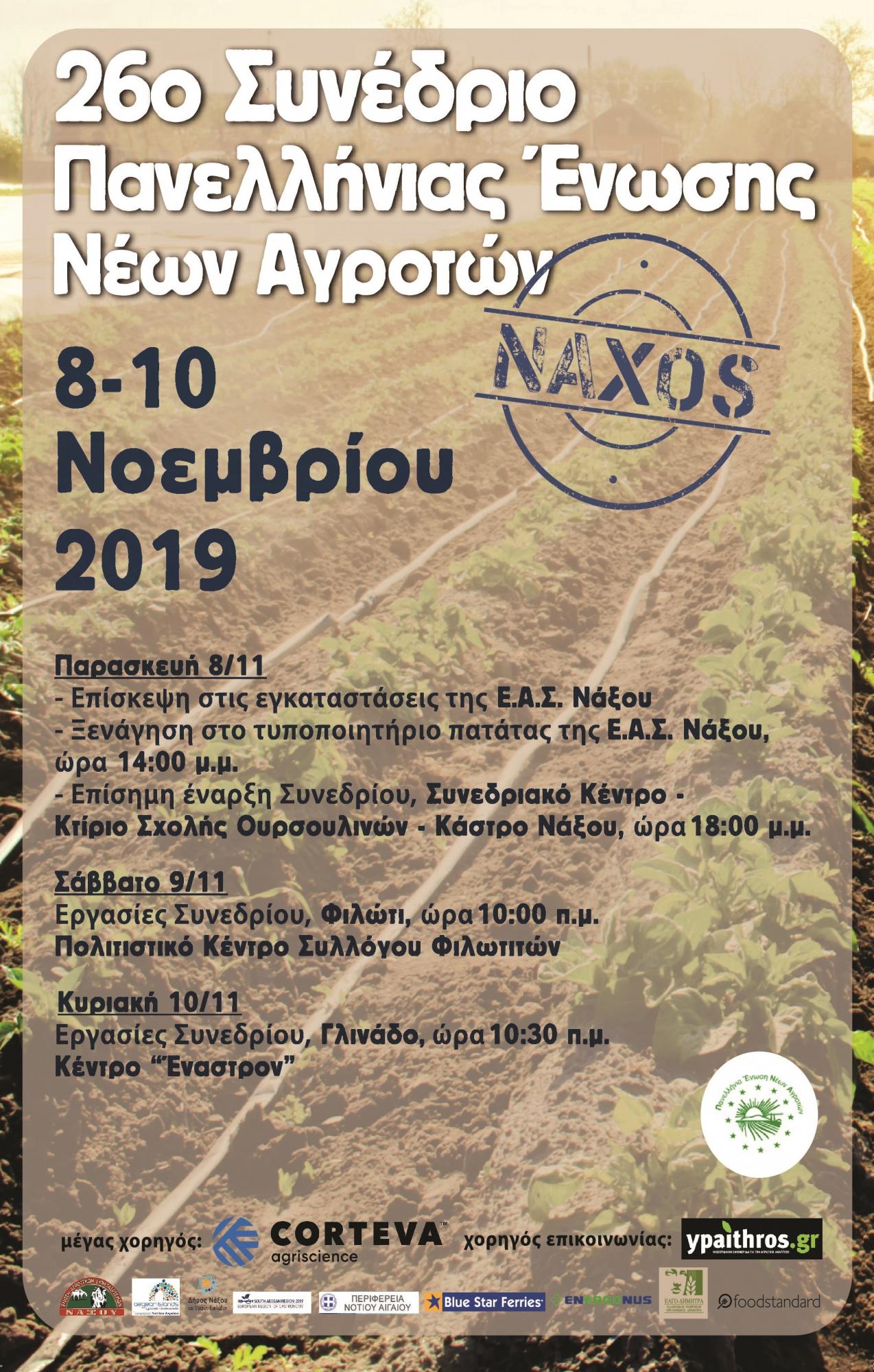 Το τριήμερο 8-10 Νοεμβρίου το πιο δυναμικό κομμάτι του πρωτογενή τομέα στην Ελλάδα, οι Νέοι Αγρότες, θα είναι στην όμορφη Νάξο για το 26ο Συνέδριο της Πανελλήνιας Ένωσης Νέων Αγροτών, συνδιοργανωτές του οποίου είναι η Ένωση Αγροτικών Συνεταιρισμών Νάξου, η Περιφέρεια Νοτίου Αιγαίου και ο Δήμος Νάξου!