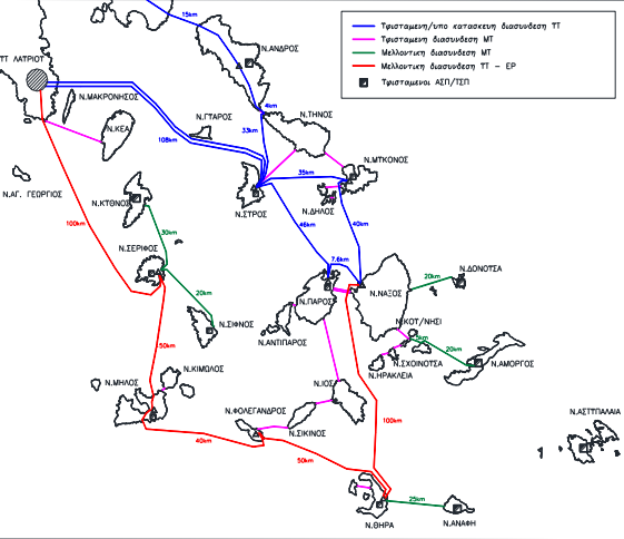 5. Σέριφος - Λαύριο: διασύνδεση με υποβρύχιο τριπολικό καλώδιο Ε.Ρ. XLPE 150 kV, ονομαστικής ικανότητας 200 MVA, μήκους 100 km.