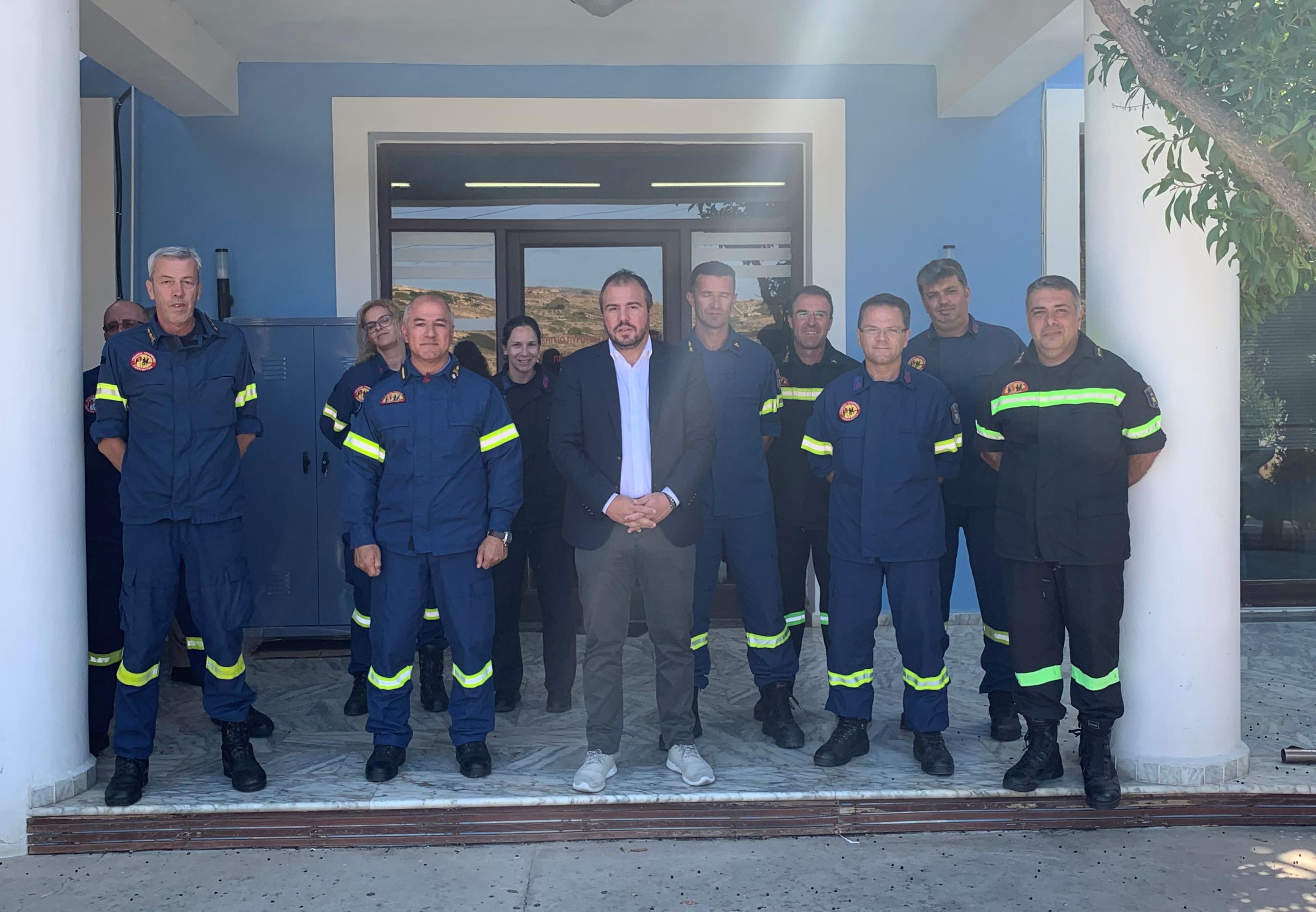 Στη συνέχεια ο κ. Φόρτωμας επισκέφθηκε το κτίριο που στεγάζονται οι Υπηρεσίες του Πυροσβεστικού Σώματος και συναντήθηκε με τους επικεφαλής Αξιωματικούς, τον Αρχιπύραρχο Βασίλη Κοκμοτό, τον Πύραρχο Χριστόδουλο Παπαμιχαήλ, Διοικητή Πυροσβεστικών Υπηρεσιών Νομού Κυκλάδων και τον Επιπυραγό Δημήτρη Σκόνδρα, Διοικητή της Πυροσβεστικής Υπηρεσίας Ερμούπολης. Κατά τη διάρκεια της συνάντησης τους, συζητήθηκαν θέματα που αφορούν την πυρασφάλεια, την πυροπροστασία και την πολιτική προστασία κυρίως στα νησιά των Κυκλάδων. Ο κ. Φόρτωμας ενημερώθηκε αναλυτικά για τις επικρατούσες συνθήκες στις Πυροσβεστικές Υπηρεσίες των Κυκλάδων, τις υποδομές τους και την ανάγκη στελέχωσής τους με ανθρώπινο δυναμικό. Επιπλέον, τόνισε την σημαίνουσα σημασία που έχει, με κυβερνητική πρωτοβουλία, η ίδρυση και λειτουργία εποχικού Πυροσβεστικού Κλιμακίου Δ.Ε. Πανόρμου Τήνου, Κορθίου Άνδρου και Κορώνου Νάξου.