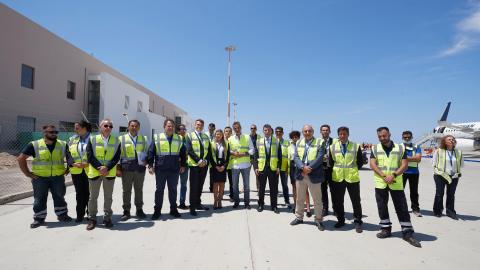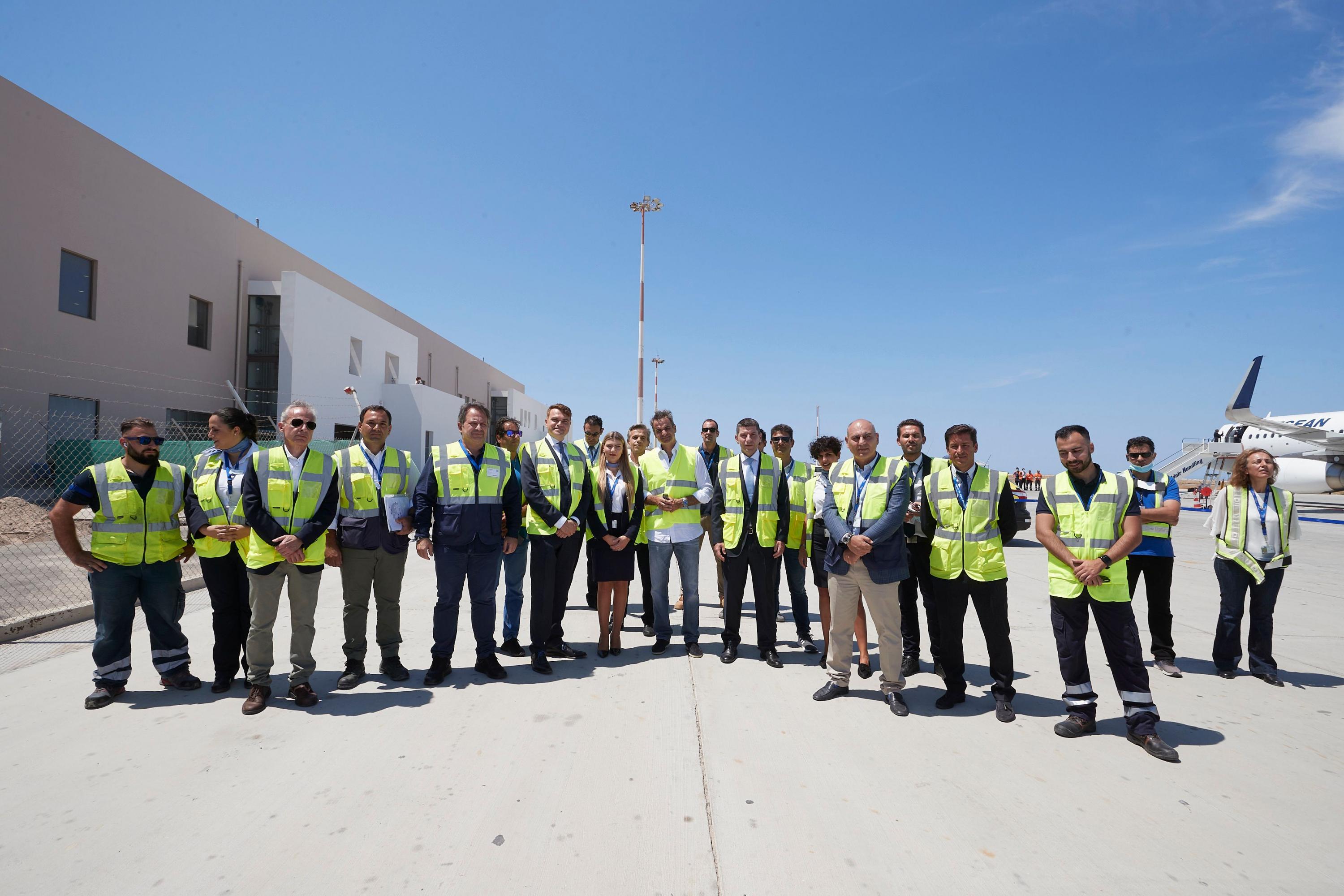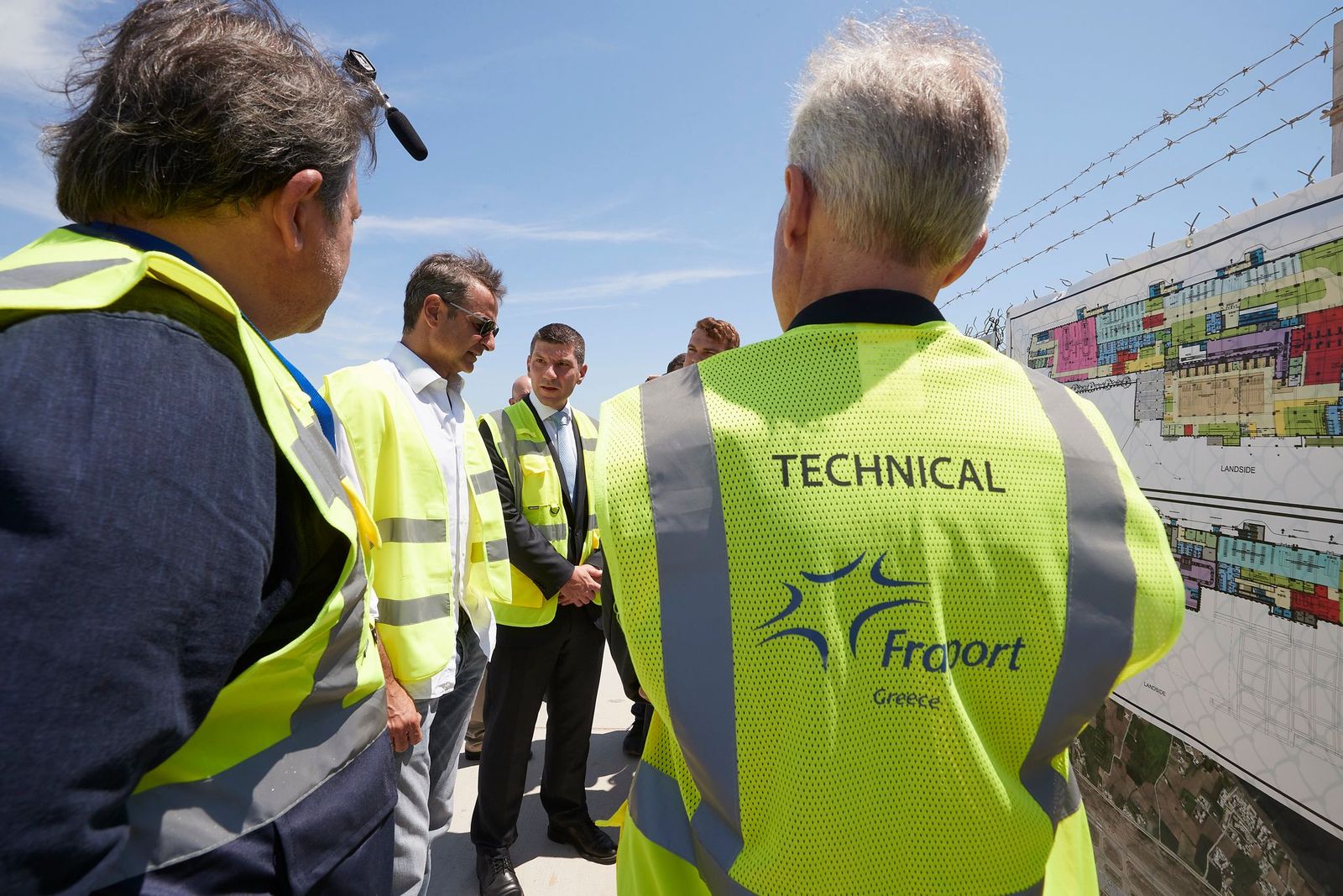 Τον Πρωθυπουργό ξενάγησαν στο εργοτάξιο ο Γενικός Οικονομικός Διευθυντής της Fraport Greece, Βαγγέλης Μπαλτάς, o Διευθυντής Λειτουργιών της εταιρείας Ηλίας Μαραγκάκης, ο υπεύθυνος του κατασκευαστικού έργου Κωνσταντίνος Θεοφανίδης και ο διαχειριστής του αεροδρομίου, Δημήτρης Παντελής.