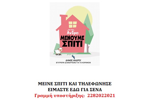 Μέχρι τις 30-11-2020 είναι σε ισχύ τα νέα μέτρα έναντι covid-19 (lockdown). Ο Δήμος Άνδρου έχει ενεργοποιήσει το τηλεφωνικό κέντρο υποστήριξης και εμψύχωσης, στο πλαίσιο της λειτουργίας των υπηρεσιών του για την κοινωνική φροντίδα και αλληλεγγύη.