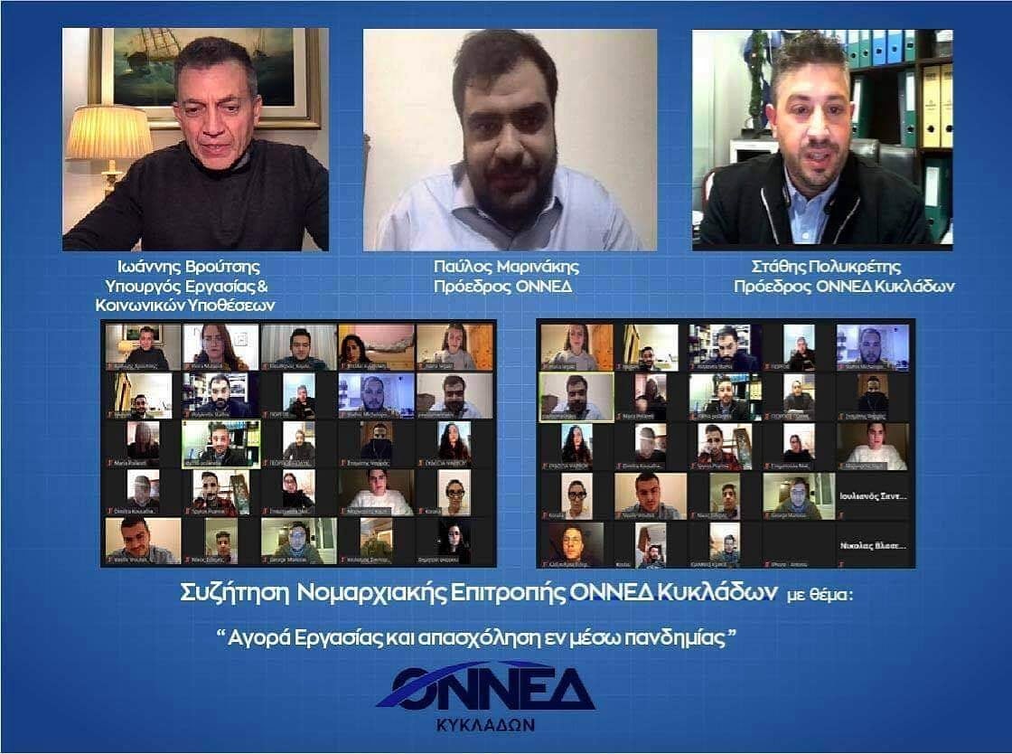 Με επιτυχία πραγματοποιήθηκε το Σάββατο 12 Δεκεμβρίου 2020 συζήτηση της ΟΝΝΕΔ Κυκλάδων με τον Υπουργό Εργασίας & Κοινωνικών Υποθέσεων κ. Ιωάννη Βρούτση με θέμα «Αγορά εργασίας και απασχόληση εν μέσω πανδημίας: δυνατότητες & προοπτικές», παρουσία του Προέδρου της ΟΝΝΕΔ Παύλου Μαρινάκη.