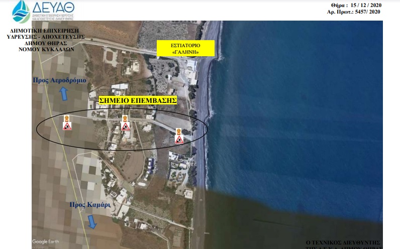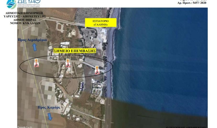 Η Δ.Ε.Υ.Α. Θήρας γνωστοποιεί την περιοδική διακοπή της κυκλοφορίας στην περιοχή του Μονολίθου και συγκεκριμένα επί της προηγούμενης κάθετης οδού, πριν το δρόμο που οδηγεί στο εστιατόριο «ΓΑΛΗΝΗ», με κατεύθυνση προς το αεροδρόμιο, λόγω εργασιών στο δίκτυο αποχέτευσης της Δ.Ε.Υ.Α.Θ.