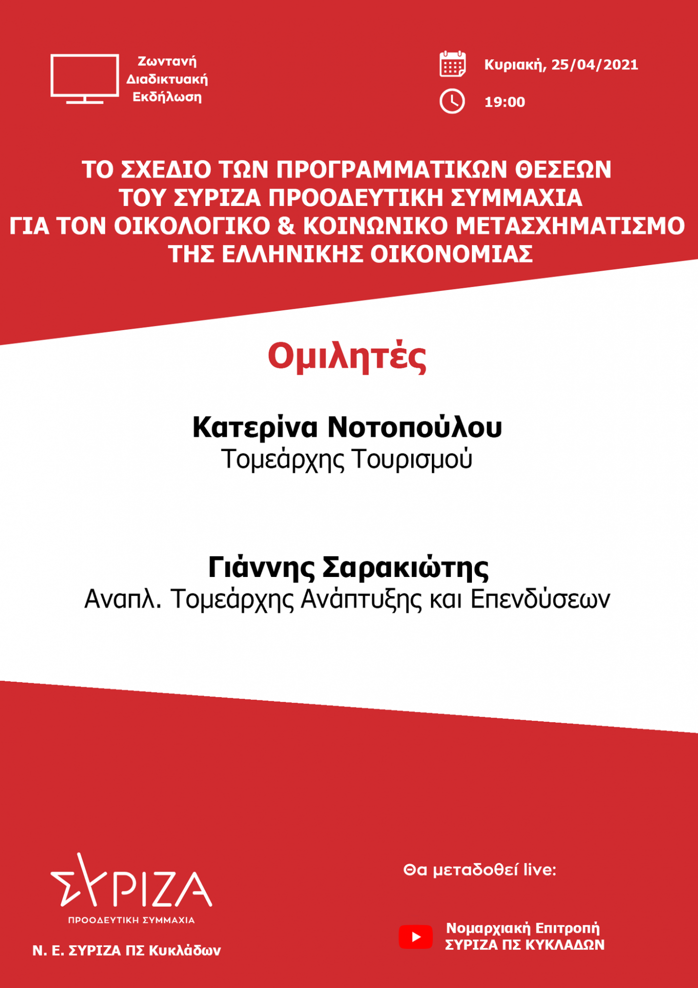 Η εκδήλωση-συζήτηση θα μεταδοθεί ζωντανά από το κανάλι της Νομαρχιακής Επιτροπής ΣΥΡΙΖΑ ΠΣ ΚΥΚΛΑΔΩΝ στο youtube: https://www.youtube.com/watch?v=psKMrunYQag