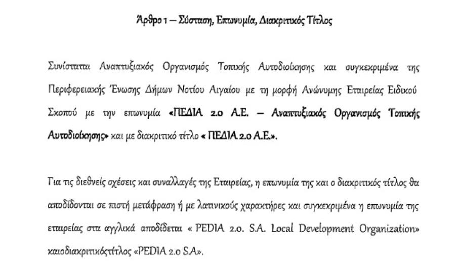Υψηλότερη ευελιξία στη λήψη περισσότερων χρηματοδοτήσεων και στην υλοποίηση έργων προς όφελος της πρωτεύουσας των Κυκλάδων, προσδοκά ο Δήμος Σύρου – Ερμούπολης μέσα από τη συμμετοχή του στον Αναπτυξιακό Οργανισμό της ΠΕΔ Ν. Αιγαίου με την επωνυμία “ΠΕΔΙΑ 2.0 Α.Ε.”.
