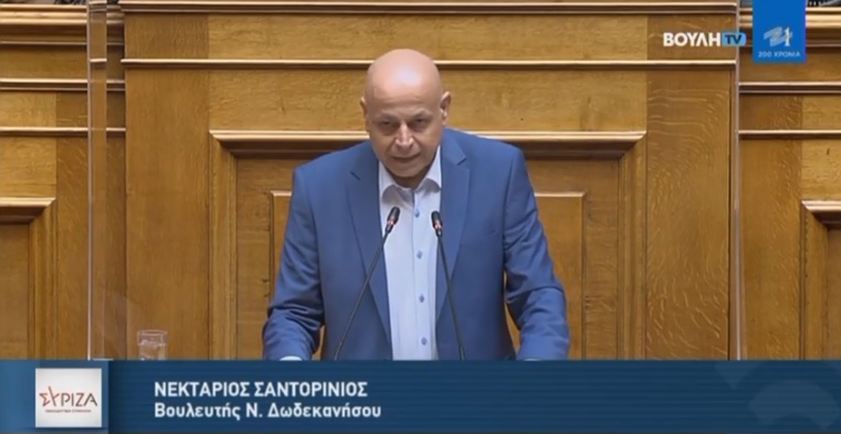 Παρατίθενται αποσπάσματα από τη σημερινή ομιλία, στην Ολομέλεια της Βουλής, του βουλευτή Δωδεκανήσου και Τομεάρχη Ναυτιλίας και Νησιωτικής Πολιτικής του ΣΥΡΙΖΑ-ΠΣ, Νεκτάριου Σαντορινιού. «Ενισχύστε τα νησιά μας, ενισχύστε τον τουρισμό, τις μονάδες Υγείας, τις μικρομεσαίες επιχειρήσεις, ασκήστε ουσιαστικές νησιωτικές πολιτικές. Ανοίξτε το Μεταφορικό Ισοδύναμο σε όλους τους πολίτες για να στηρίξετε τα νησιά και τον εσωτερικό τουρισμό, επαναφέρετε τον μειωμένο ΦΠΑ συνολικά» τόνισε μεταξύ άλλων,  κατά τη συζήτηση του νομοσχεδίου για το πλαίσιο άσκησης οικονομικών και παραγωγικών δραστηριοτήτων αρμοδιότητας των Υπουργείων Ανάπτυξης & Επενδύσεων, Υποδομών και Μεταφορών, Υγείας και Τουρισμού.