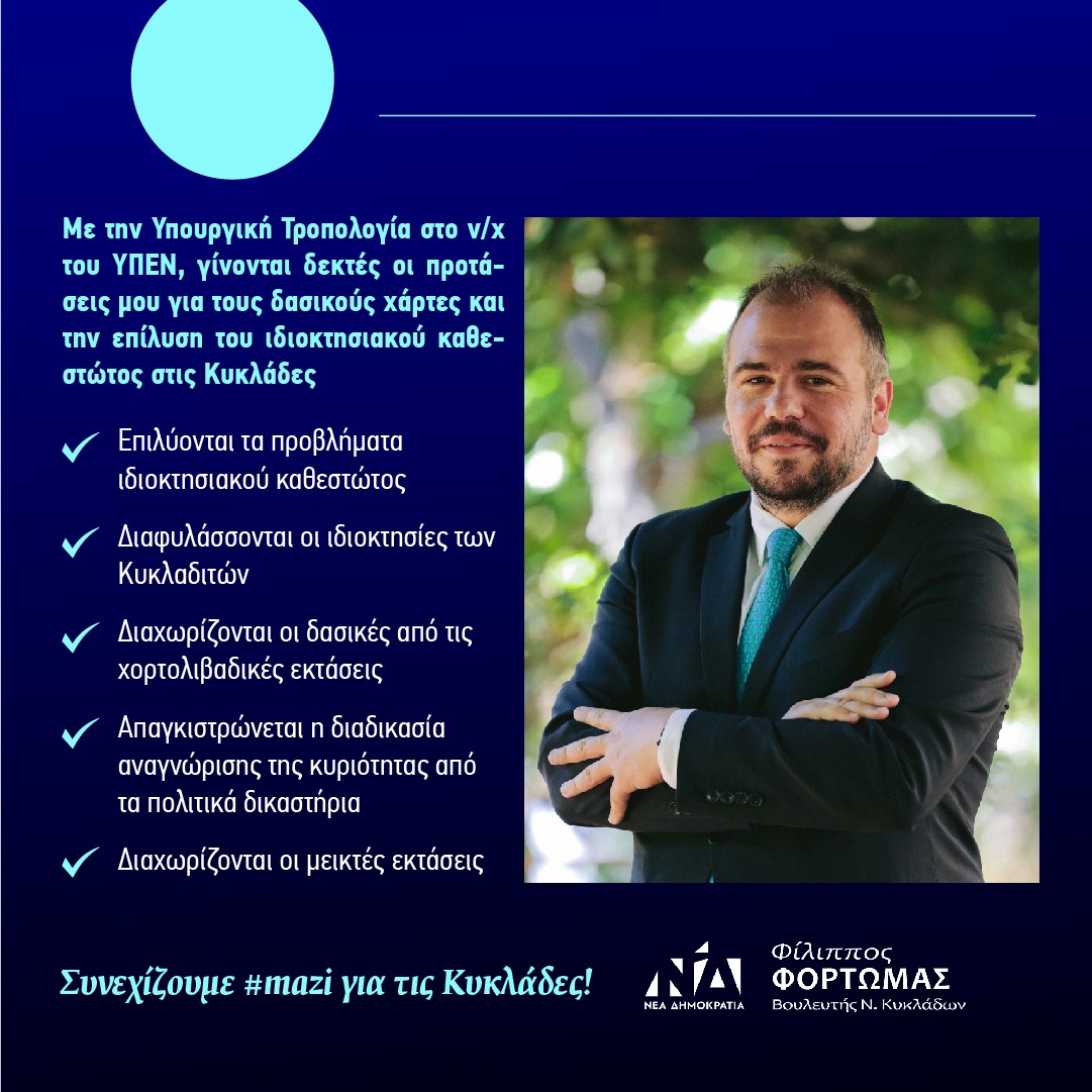 «Χαιρετίζω τη νομοθετική πρωτοβουλία της ηγεσίας του Υπουργείου, που ενσωματώνει προτάσεις που εγώ ο ίδιος προσωπικά, σε συνεργασία με υπηρεσιακούς παράγοντες, είχα προωθήσει από τον Δεκέμβριο του 2020. Μέσα από αυτές τις αλλαγές διαφυλάσσονται οι ιδιοκτησίες όλων των Κυκλαδιτών, απομακρύνεται ο κίνδυνος απώλειάς τους και αποσαφηνίζεται ο χαρακτηρισμός τους! Η προστασία του φυσικού περιβάλλοντος και της πολιτιστικής μας κληρονομιάς, είναι υπόθεση όλων μας. Ευχαριστώ προσωπικά και την Έπαρχο Μήλου κ. Έλλη Χωριανοπούλου για τη σημαντική συμβολή της»,  δήλωσε  ο κ. Φόρτωμας.