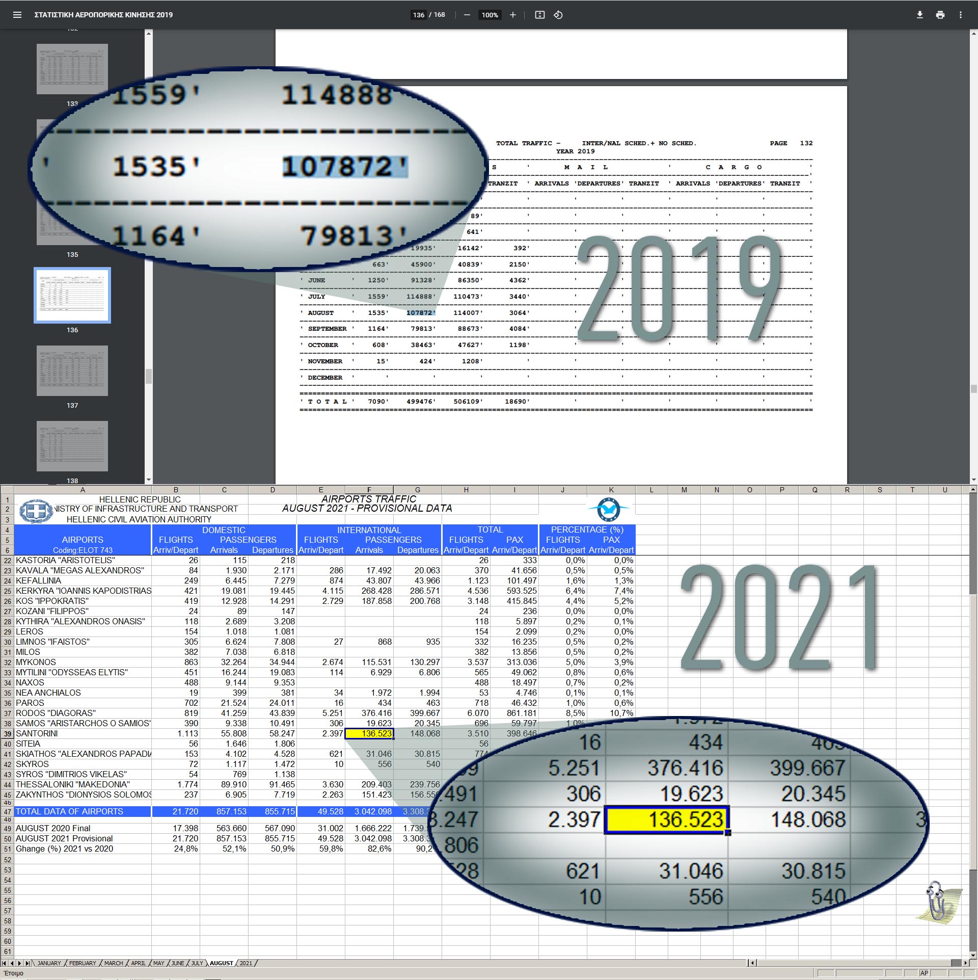 Η αύξηση αυτή μεταφράζεται σε ποσοστό 27% συνεχίζοντας την αντίστοιχη τάση του Ιουλίου. Αναλυτικά τον Αύγουστο του 2019 οι διεθνείς αφίξεις ήταν 107.872 ενώ τον Αύγουστο 2021 άγγιξαν τις 136.523.