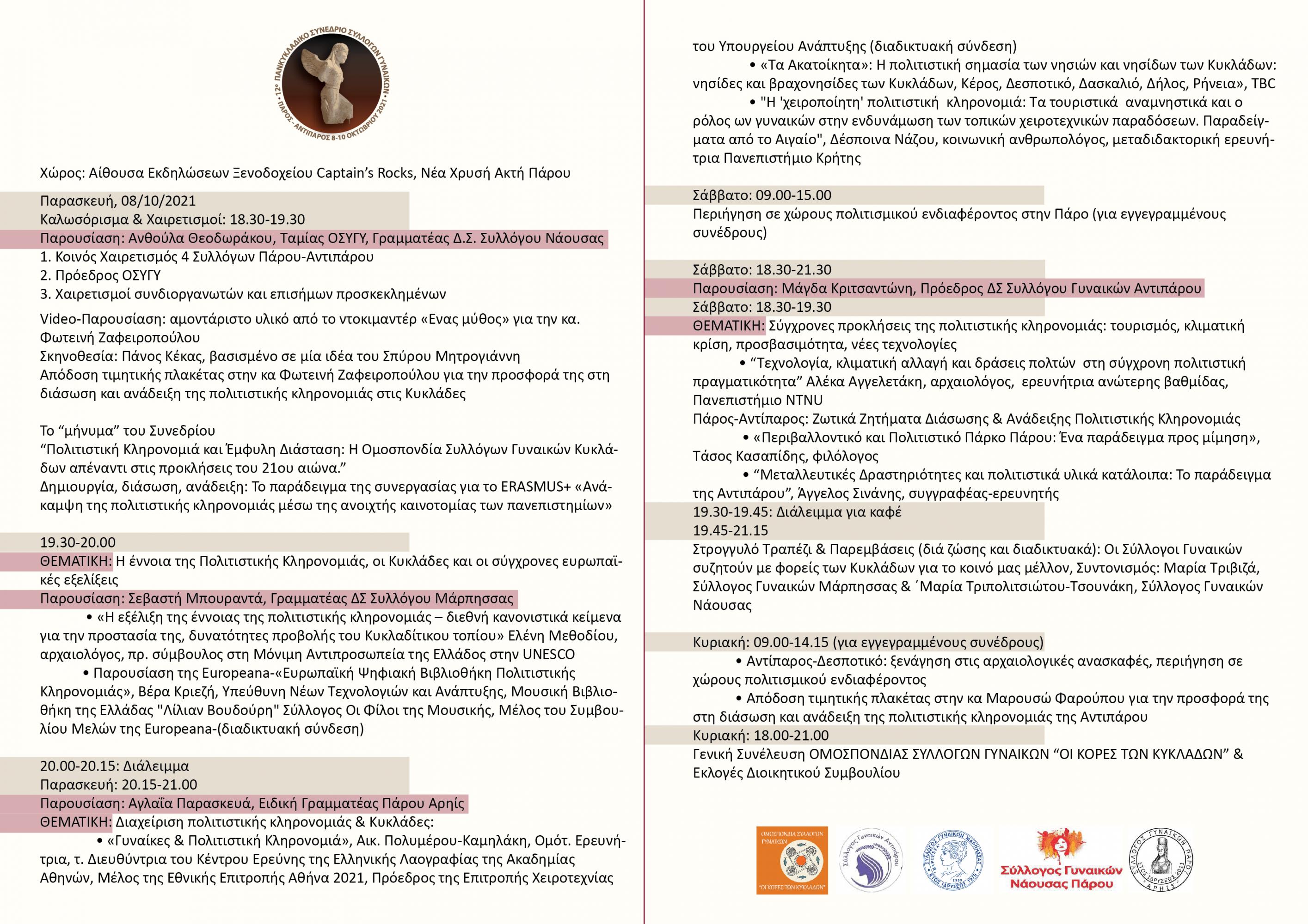 Το έμπρακτο ενδιαφέρον για την νέα πολιτιστική δημιουργία καθώς και την διάσωση και την ανάδειξη της πολιτισμικής κληρονομιάς των Κυκλάδων αποτυπώνεται στο πρόγραμμα του 12ο Πανκυκλαδικού Συνέδριου της Ομοσπονδίας Συλλόγων Γυναικών Κυκλάδων που διοργανώνεται στα νησιά της Πάρου και της Αντιπάρου από την Παρασκευή 8 έως την Κυριακή 10 Οκτωβρίου 2021. Θα υλοποιηθεί σε συνεργασία με τους 4 Συλλόγους Γυναικών της Περιφερειακής Ενότητας Πάρου-Αντιπάρου: Σύλλογος Γυναικών Αντιπάρου, Σύλλογος Γυναικών Νάουσας Πάρου, Σύλλογος Γυναικών Μάρπησσας και Σύλλογος Γυναικών Πάρου “Αρηίς”.