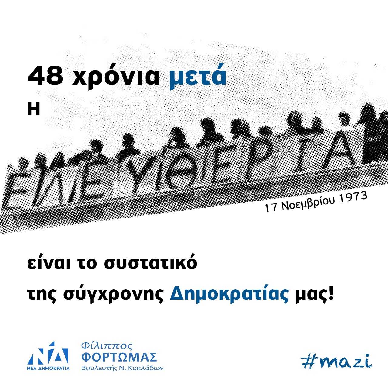 Η επέτειος του Πολυτεχνείου είναι μια ημέρα ιστορικής μνήμης. Είναι μια ημέρα γιορτής της ελευθερίας και της δημοκρατίας, που δεν τιμάται μόνο σήμερα. Τιμάται κάθε μέρα με το σεβασμό στην ελευθερία, στη δημοκρατία και τη διαφορετικότητα. 48 χρόνια από τότε, οι μνήμες μένουν ζωντανές και τα μηνύματα παραμένουν επίκαιρα. Η δύναμη της νεολαίας είναι αυτή που διαχρονικά φέρνει ανατροπές και αλλαγές που καθορίζουν το μέλλον ενός τόπου.