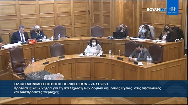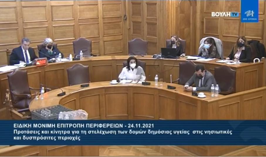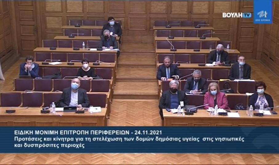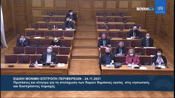 Από εκπροσώπους του Ν. Αιγαίου και των Κυκλάδων κατά τη διάρκεια της συνεδρίασης της Ειδικής Μόνιμης Επιτροπής Περιφερειών στη Βουλή με μοναδικό θέμα την ενίσχυση των δομών στις νησιωτικές και δυσπρόσιτες περιοχές της χώρας