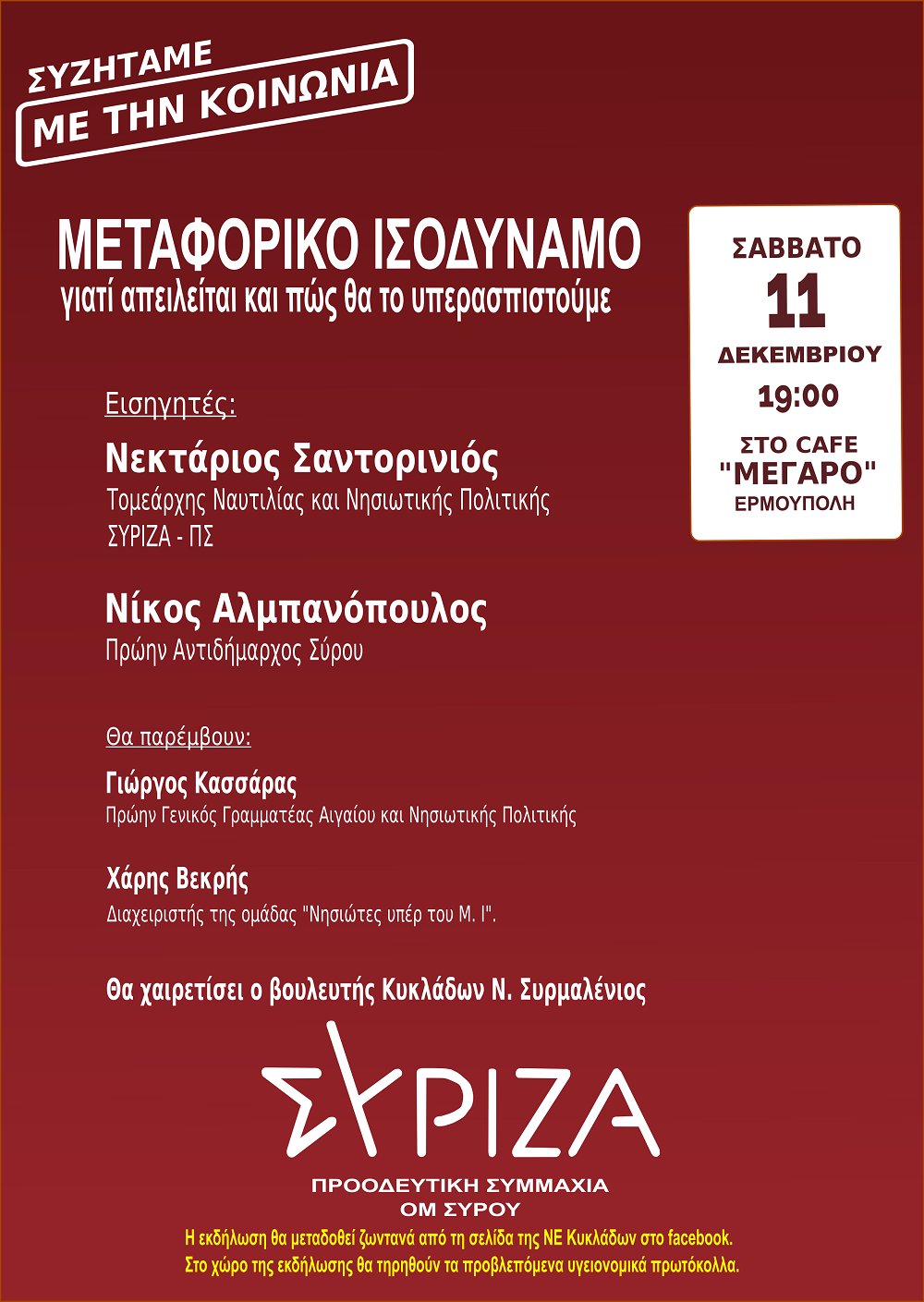 Ανοιχτή εκδήλωση - συζήτηση με θέμα «Μεταφορικό Ισοδύναμο: γιατί απειλείται και πώς μπορούμε να το υπερασπιστούμε» διοργανώνουν η Νομαρχιακή Επιτροπή Κυκλάδων ΣΥΡΙΖΑ - ΠΣ και η Οργάνωση Μελών Σύρου, στο πλαίσιο του διαλόγου με την κοινωνία ενόψει του 3ου Συνεδρίου του ΣΥΡΙΖΑ - ΠΣ, το Σάββατο 11 Δεκεμβρίου 2021, ώρα 19.00, στο Καφέ «Μέγαρο», στην Ερμούπολη.