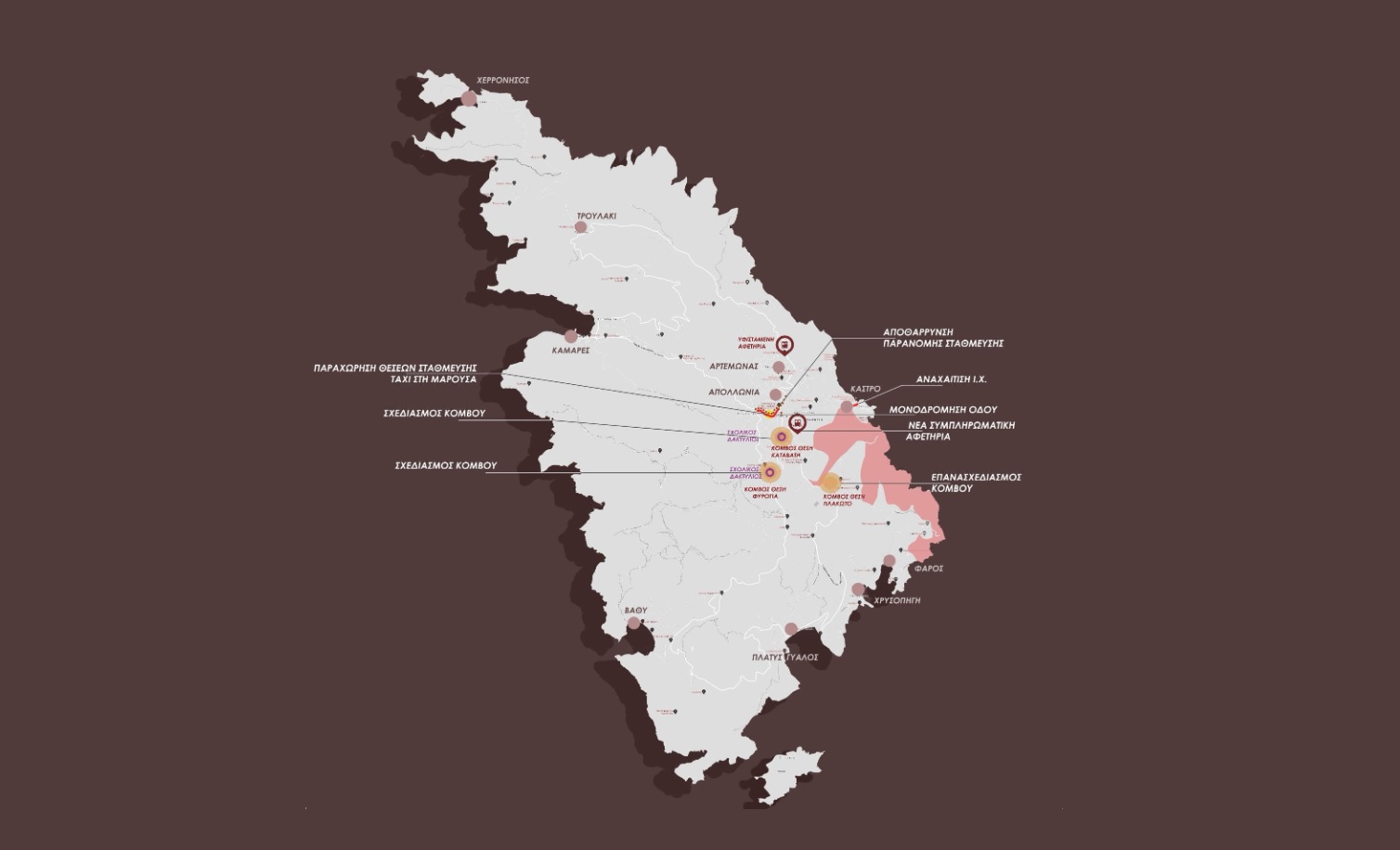 Επισημαίνεται επιπλέον, ότι οι κόμβοι στις θέσεις Απολλωνία, Καταβατή, Φυρόγια και Πλακωτό, κρίνονται ως δυσλειτουργικοί και εγκυμονούν πολλούς κινδύνους οδικής ασφάλειας. Στις περιπτώσεις των κόμβων σε Καταβατή και Φυρόγια, η εγγύτητα με σχολικές μονάδες καθιστά αναγκαία τη δημιουργία κυκλικού κόμβου, ώστε να υπάρχει σαφής οριοθέτηση και διοχέτευση της μηχανοκίνητης κυκλοφορίας. Στη θέση Πλακωτό έχει κατασκευαστεί πρόσφατα ο μοναδικός κυκλικός κόμβος, χωρίς όμως να έχει βελτιωθεί η οδική ασφάλεια, ενώ ο κεντρικός κόμβος της Απολλωνίας είναι αποδέκτης του συνόλου των εκτελούμενων γραμμών δημόσιας συγκοινωνίας, με αποτέλεσμα τη συμφόρηση του κεντρικού τμήματος του οικισμού, με την ταυτόχρονη διέλευση των λεωφορείων και τα γεωμετρικά χαρακτηριστικά της διασταύρωσης, να καθιστούν τον κόμβο δυσλειτουργικό.